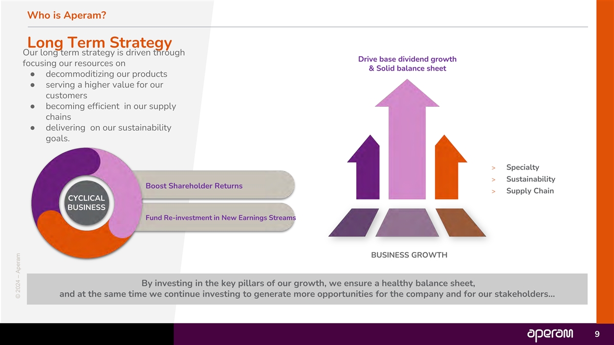 Who is Aperam? Long Term Strategy Our long term strategy is driven through Drive base dividend growth focusing our resources on & Solid balance sheet ● decommoditizing our products ● serving a higher value for our customers ● becoming efficient in our supply chains ● delivering on our sustainability goals. > Specialty > Sustainability Boost Shareholder Returns > Supply Chain CYCLICAL BUSINESS Fund Re-investment in New Earnings Streams BUSINESS GROWTH By investing in the key pillars of our growth, we ensure a healthy balance sheet, and at the same time we continue investing to generate more opportunities for the company and for our stakeholders... 9 © 2024 – Aperam