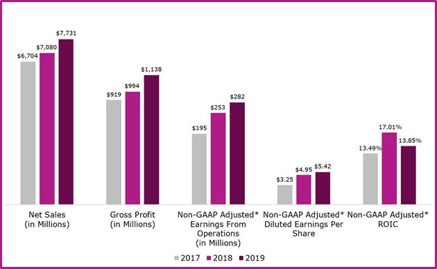 In 2019, we reported record net sales of $7.7 billion, an increase of 9% over 2018. The addition of PCM combined with our team’s focus on our solution area strategy and expanding our services offerings, drove gross profit growth faster than sales at 15% year over year, and improved gross margin by 70 basis points to 14.7%, also a new record for the company. Top line growth and gross margin expansion combined with continued expense discipline drove non-GAAP Adjusted earnings from operations up 11% in 2019 compared to the prior year. |