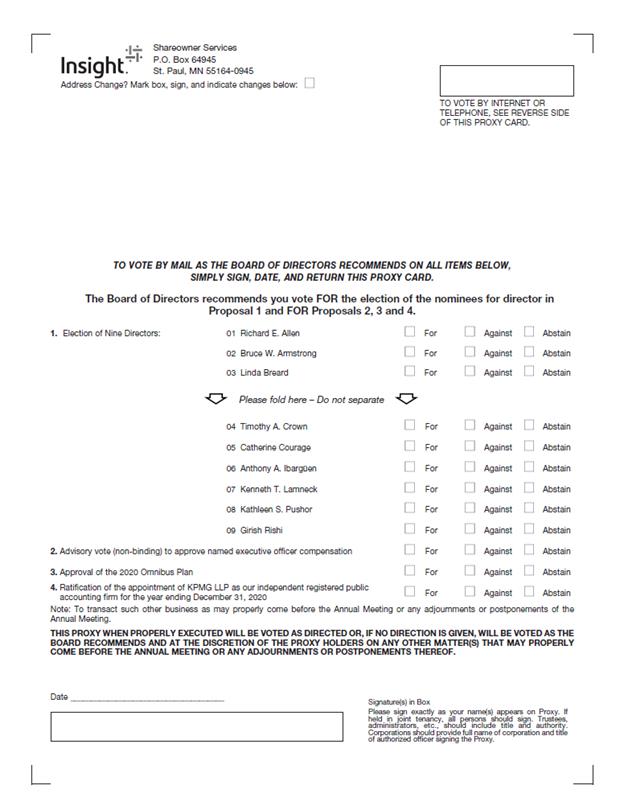 Shareowner Services P.O. Box 64945 St. Paul, MN 55164-0945 Address Change? Mark box, sign, and indicate changes below: TO VOTE BY INTERNET OR TELEPHONE, SEE REVERSE SIDE OF THIS PROXY CARD. TO VOTE BY MAIL AS THE BOARD OF DIRECTORS RECOMMENDS ON ALL ITEMS BELOW, SIMPLY SIGN, DATE, AND RETURN THIS PROXY CARD. The Board of Directors recommends you vote FOR the election of the nominees for director in Proposal 1 and FOR Proposals 2, 3 and 4. 1.Election of Nine Directors:01 Richard E. Allen■For■Against■Abstain 02 Bruce W. Armstrong■For■Against■Abstain 03 Linda Breard For■Against■Abstain Please fold here – Do not separate 04 Timothy A. Crown■For■Against■Abstain 05 Catherine Courage■For■Against■Abstain 06 Anthony A. Ibargüen■For■Against■Abstain 07 Kenneth T. Lamneck■For■Against■Abstain 08 Kathleen S. Pushor■For■Against■Abstain 09 Girish Rishi ■For■Against■Abstain 2.Advisory vote (non-binding) to approve named executive officer compensation■For■Against■Abstain 3.Approval of the 2020 Omnibus Plan■For■Against■Abstain 4.Ratification of the appointment of KPMG LLP as our independent registered public accounting firm for the year ending December 31, 2020■For■Against■Abstain Note: To transact such other business as may properly come before the Annual Meeting or any adjournments or postponements of the Annual Meeting. THIS PROXY WHEN PROPERLY EXECUTED WILL BE VOTED AS DIRECTED OR, IF NO DIRECTION IS GIVEN, WILL BE VOTED AS THE BOARD RECOMMENDS AND AT THE DISCRETION OF THE PROXY HOLDERS ON ANY OTHER MATTER(S) THAT MAY PROPERLY COME BEFORE THE ANNUAL MEETING OR ANY ADJOURNMENTS OR POSTPONEMENTS THEREOF. Date Signature(s) in Box Please sign exactly as your name(s) appears on Proxy. If held in joint tenancy, all persons should sign. Trustees, adminis trators, etc., should include title and authority. Corporations should provide full name of corporation and title of authorized officer signing the Proxy.