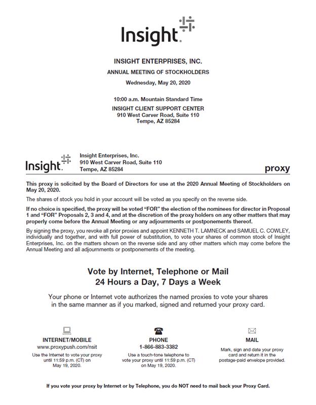 INSIGHT ENTERPRISES, INC. ANNUAL MEETING OF STOCKHOLDERS Wednesday, May 20, 2020 10:00 a.m. Mountain Standard Time INSIGHT CLIENT SUPPORT CENTER 910 West Carver Road, Suite 110 Tempe, AZ 85284 Insight Enterprises, Inc. 910 West Carver Road, Suite 110 Tempe, AZ 85284proxy This proxy is solicited by the Board of Directors for use at the 2020 Annual Meeting of Stockholders on May 20, 2020. The shares of stock you hold in your account will be voted as you specify on the reverse side. If no choice is specified, the proxy will be voted “FOR” the election of the nominees for director in Proposal 1 and “FOR” Proposals 2, 3 and 4, and at the discretion of the proxy holders on any other matters that may properly come before the Annual Meeting or any adjournments or postponements thereof. By signing the proxy, you revoke all prior proxies and appoint KENNETH T. LAMNECK and SAMUEL C. COWLEY, individually and together, and with full power of substitution, to vote your shares of common stock of Insight Enterprises, Inc. on the matters shown on the reverse side and any other matters which may come before the Annual Meeting and all adjournments or postponements of the meeting.Vote by Internet, Telephone or Mail 24 Hours a Day, 7 Days a Week Your phone or Internet vote authorizes the named proxies to vote your shares in the same manner as if you marked, signed and returned your proxy card. :(* INTERNET/MOBILEPHONEMAIL www.proxypush.com/nsit1-866-883-3382 Mark, sign and date your proxy Use the Internet to vote your proxyUse a touch-tone telephone tocard and return it in the until 11:59 p.m. (CT) onvote your proxy until 11:59 p.m. (CT)postage-paid envelope provided. May 19, 2020.on May 19, 2020. If you vote your proxy by Internet or by Telephone, you do NOT need to mail back your Proxy Card.