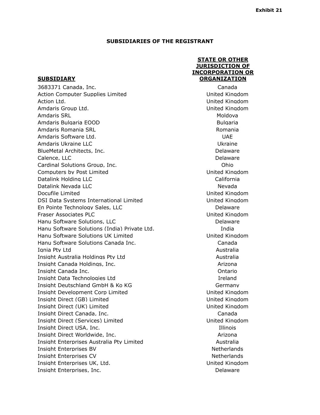 Exhibit 21 SUBSIDIARIES OF THE REGISTRANT SUBSIDIARY STATE OR OTHER JURISDICTION OF INCORPORATION OR ORGANIZATION 3683371 Canada, Inc. Canada Action Computer Supplies Limited United Kingdom Action Ltd. United Kingdom Amdaris Group Ltd. United Kingdom Amdaris SRL Moldova Amdaris Bulgaria EOOD Bulgaria Amdaris Romania SRL Romania Amdaris Software Ltd. UAE Amdaris Ukraine LLC Ukraine BlueMetal Architects, Inc. Delaware Calence, LLC Delaware Cardinal Solutions Group, Inc. Ohio Computers by Post Limited United Kingdom Datalink Holding LLC California Datalink Nevada LLC Nevada Docufile Limited United Kingdom DSI Data Systems International Limited United Kingdom En Pointe Technology Sales, LLC Delaware Fraser Associates PLC United Kingdom Hanu Software Solutions, LLC Delaware Hanu Software Solutions (India) Private Ltd. India Hanu Software Solutions UK Limited United Kingdom Hanu Software Solutions Canada Inc. Canada Ignia Pty Ltd Australia Insight Australia Holdings Pty Ltd Australia Insight Canada Holdings, Inc. Arizona Insight Canada Inc. Ontario Insight Data Technologies Ltd Ireland Insight Deutschland GmbH & Ko KG Germany Insight Development Corp Limited United Kingdom Insight Direct (GB) Limited United Kingdom Insight Direct (UK) Limited United Kingdom Insight Direct Canada, Inc. Canada Insight Direct (Services) Limited United Kingdom Insight Direct USA, Inc. Illinois Insight Direct Worldwide, Inc. Arizona Insight Enterprises Australia Pty Limited Australia Insight Enterprises BV Netherlands Insight Enterprises CV Netherlands Insight Enterprises UK, Ltd. United Kingdom Insight Enterprises, Inc. Delaware