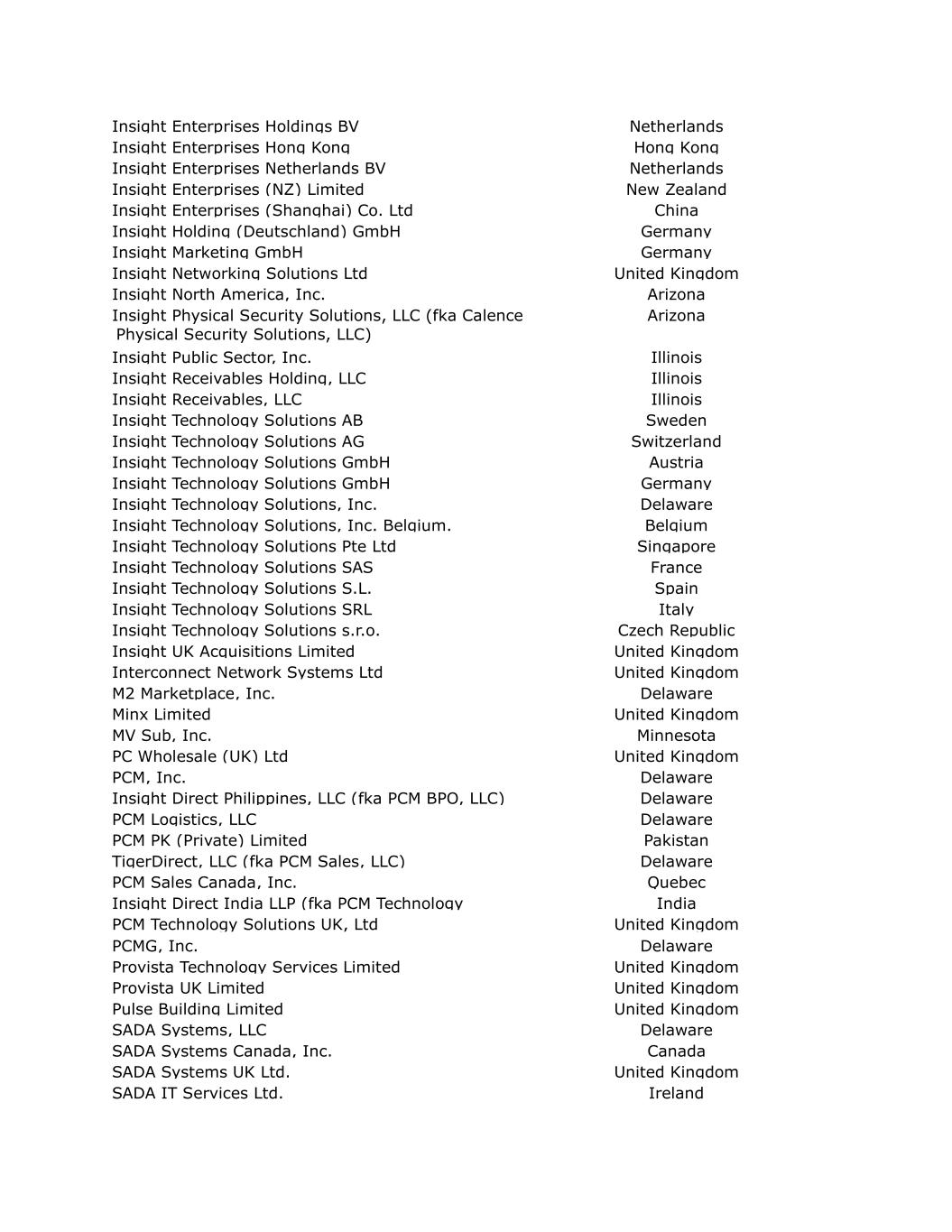 Insight Enterprises Holdings BV Netherlands Insight Enterprises Hong Kong Hong Kong Insight Enterprises Netherlands BV Netherlands Insight Enterprises (NZ) Limited New Zealand Insight Enterprises (Shanghai) Co. Ltd China Insight Holding (Deutschland) GmbH Germany Insight Marketing GmbH Germany Insight Networking Solutions Ltd United Kingdom Insight North America, Inc. Arizona Insight Physical Security Solutions, LLC (fka Calence Physical Security Solutions, LLC) Arizona Insight Public Sector, Inc. Illinois Insight Receivables Holding, LLC Illinois Insight Receivables, LLC Illinois Insight Technology Solutions AB Sweden Insight Technology Solutions AG Switzerland Insight Technology Solutions GmbH Austria Insight Technology Solutions GmbH Germany Insight Technology Solutions, Inc. Delaware Insight Technology Solutions, Inc. Belgium. Belgium Insight Technology Solutions Pte Ltd Singapore Insight Technology Solutions SAS France Insight Technology Solutions S.L. Spain Insight Technology Solutions SRL Italy Insight Technology Solutions s.r.o. Czech Republic Insight UK Acquisitions Limited United Kingdom Interconnect Network Systems Ltd United Kingdom M2 Marketplace, Inc. Delaware Minx Limited United Kingdom MV Sub, Inc. Minnesota PC Wholesale (UK) Ltd United Kingdom PCM, Inc. Delaware Insight Direct Philippines, LLC (fka PCM BPO, LLC) Delaware PCM Logistics, LLC Delaware PCM PK (Private) Limited Pakistan TigerDirect, LLC (fka PCM Sales, LLC) Delaware PCM Sales Canada, Inc. Quebec Insight Direct India LLP (fka PCM Technology India PCM Technology Solutions UK, Ltd United Kingdom PCMG, Inc. Delaware Provista Technology Services Limited United Kingdom Provista UK Limited United Kingdom Pulse Building Limited United Kingdom SADA Systems, LLC Delaware SADA Systems Canada, Inc. Canada SADA Systems UK Ltd. United Kingdom SADA IT Services Ltd. Ireland