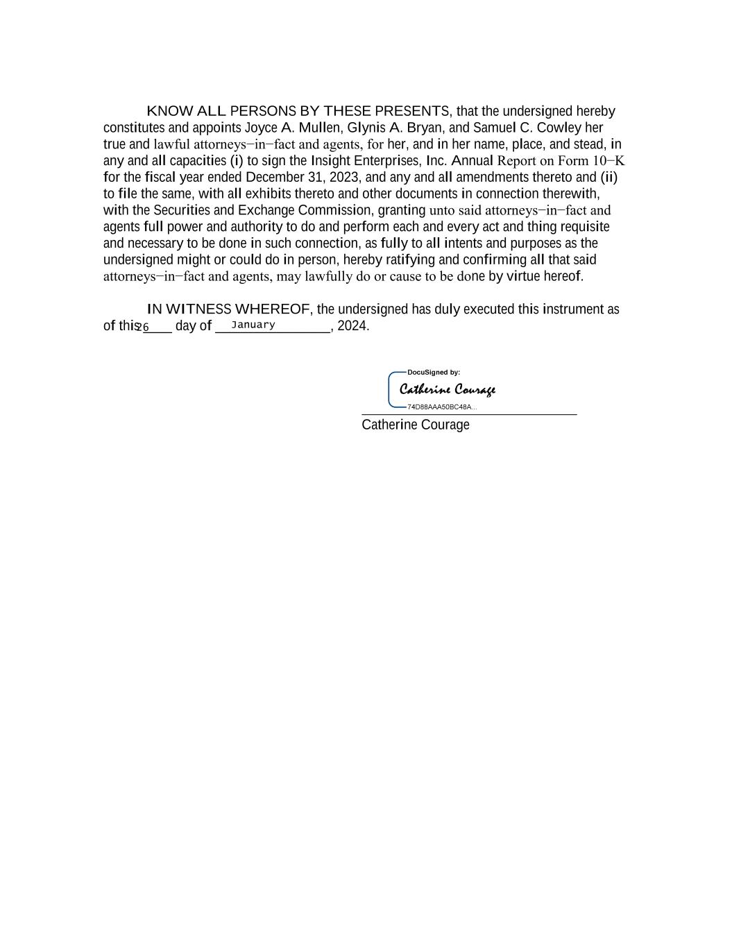 KNOW ALL PERSONS BY THESE PRESENTS, that the undersigned hereby constitutes and appoints Joyce A. Mullen, Glynis A. Bryan, and Samuel C. Cowley her true and lawful attorneys−in−fact and agents, for her, and in her name, place, and stead, in any and all capacities (i) to sign the Insight Enterprises, Inc. Annual Report on Form 10−K for the fiscal year ended December 31, 2023, and any and all amendments thereto and (ii) to file the same, with all exhibits thereto and other documents in connection therewith, with the Securities and Exchange Commission, granting unto said attorneys−in−fact and agents full power and authority to do and perform each and every act and thing requisite and necessary to be done in such connection, as fully to all intents and purposes as the undersigned might or could do in person, hereby ratifying and confirming all that said attorneys−in−fact and agents, may lawfully do or cause to be done by virtue hereof. IN WITNESS WHEREOF, the undersigned has duly executed this instrument as of this ____ day of ________________, 2024. Catherine Courage 26 January