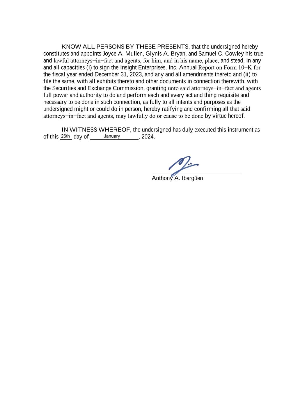 KNOW ALL PERSONS BY THESE PRESENTS, that the undersigned hereby constitutes and appoints Joyce A. Mullen, Glynis A. Bryan, and Samuel C. Cowley his true and lawful attorneys−in−fact and agents, for him, and in his name, place, and stead, in any and all capacities (i) to sign the Insight Enterprises, Inc. Annual Report on Form 10−K for the fiscal year ended December 31, 2023, and any and all amendments thereto and (ii) to file the same, with all exhibits thereto and other documents in connection therewith, with the Securities and Exchange Commission, granting unto said attorneys−in−fact and agents full power and authority to do and perform each and every act and thing requisite and necessary to be done in such connection, as fully to all intents and purposes as the undersigned might or could do in person, hereby ratifying and confirming all that said attorneys−in−fact and agents, may lawfully do or cause to be done by virtue hereof. IN WITNESS WHEREOF, the undersigned has duly executed this instrument as of this ____ day of ________________, 2024. Anthony A. Ibargüen 26th January