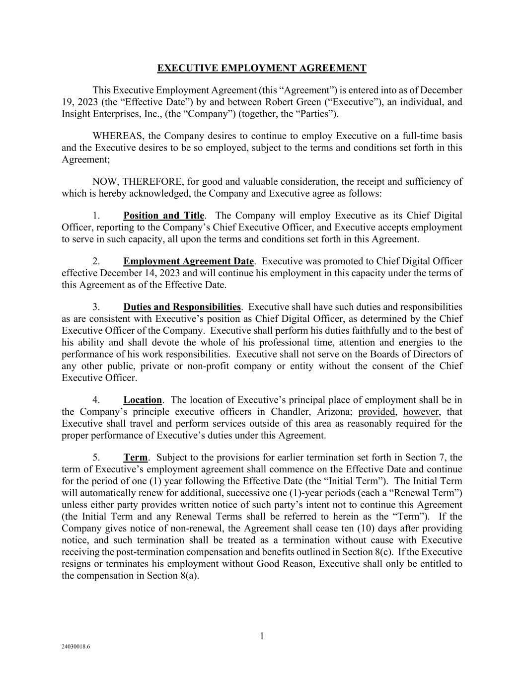 24030018.6 1 EXECUTIVE EMPLOYMENT AGREEMENT This Executive Employment Agreement (this “Agreement”) is entered into as of December 19, 2023 (the “Effective Date”) by and between Robert Green (“Executive”), an individual, and Insight Enterprises, Inc., (the “Company”) (together, the “Parties”). WHEREAS, the Company desires to continue to employ Executive on a full-time basis and the Executive desires to be so employed, subject to the terms and conditions set forth in this Agreement; NOW, THEREFORE, for good and valuable consideration, the receipt and sufficiency of which is hereby acknowledged, the Company and Executive agree as follows: 1. Position and Title. The Company will employ Executive as its Chief Digital Officer, reporting to the Company’s Chief Executive Officer, and Executive accepts employment to serve in such capacity, all upon the terms and conditions set forth in this Agreement. 2. Employment Agreement Date. Executive was promoted to Chief Digital Officer effective December 14, 2023 and will continue his employment in this capacity under the terms of this Agreement as of the Effective Date. 3. Duties and Responsibilities. Executive shall have such duties and responsibilities as are consistent with Executive’s position as Chief Digital Officer, as determined by the Chief Executive Officer of the Company. Executive shall perform his duties faithfully and to the best of his ability and shall devote the whole of his professional time, attention and energies to the performance of his work responsibilities. Executive shall not serve on the Boards of Directors of any other public, private or non-profit company or entity without the consent of the Chief Executive Officer. 4. Location. The location of Executive’s principal place of employment shall be in the Company’s principle executive officers in Chandler, Arizona; provided, however, that Executive shall travel and perform services outside of this area as reasonably required for the proper performance of Executive’s duties under this Agreement. 5. Term. Subject to the provisions for earlier termination set forth in Section 7, the term of Executive’s employment agreement shall commence on the Effective Date and continue for the period of one (1) year following the Effective Date (the “Initial Term”). The Initial Term will automatically renew for additional, successive one (1)-year periods (each a “Renewal Term”) unless either party provides written notice of such party’s intent not to continue this Agreement (the Initial Term and any Renewal Terms shall be referred to herein as the “Term”). If the Company gives notice of non-renewal, the Agreement shall cease ten (10) days after providing notice, and such termination shall be treated as a termination without cause with Executive receiving the post-termination compensation and benefits outlined in Section 8(c). If the Executive resigns or terminates his employment without Good Reason, Executive shall only be entitled to the compensation in Section 8(a).
