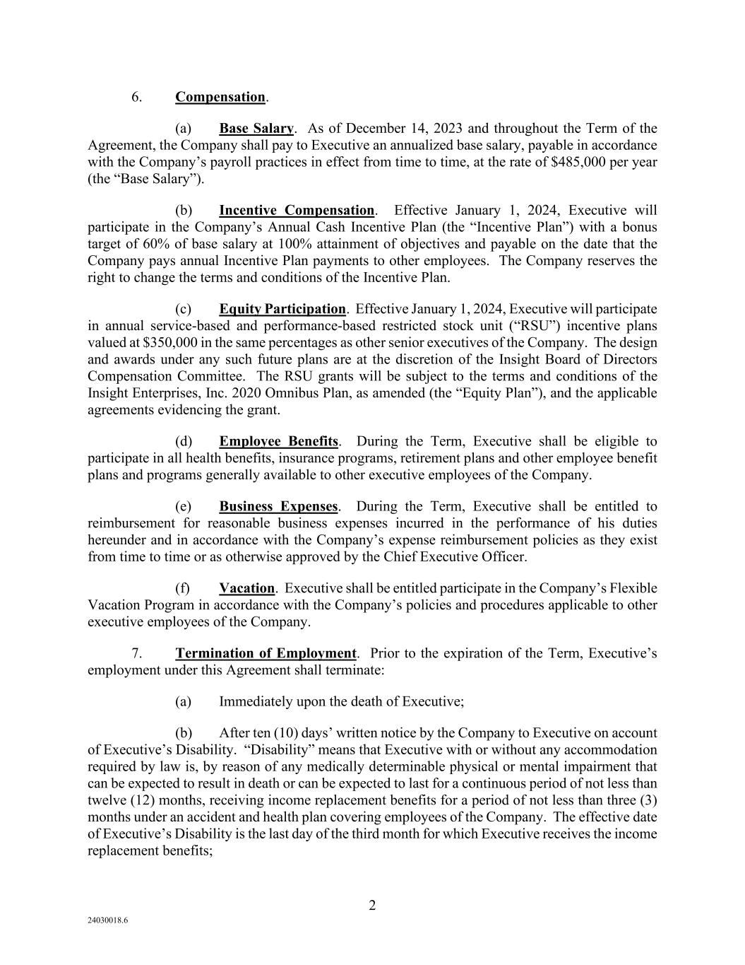 24030018.6 2 6. Compensation. (a) Base Salary. As of December 14, 2023 and throughout the Term of the Agreement, the Company shall pay to Executive an annualized base salary, payable in accordance with the Company’s payroll practices in effect from time to time, at the rate of $485,000 per year (the “Base Salary”). (b) Incentive Compensation. Effective January 1, 2024, Executive will participate in the Company’s Annual Cash Incentive Plan (the “Incentive Plan”) with a bonus target of 60% of base salary at 100% attainment of objectives and payable on the date that the Company pays annual Incentive Plan payments to other employees. The Company reserves the right to change the terms and conditions of the Incentive Plan. (c) Equity Participation. Effective January 1, 2024, Executive will participate in annual service-based and performance-based restricted stock unit (“RSU”) incentive plans valued at $350,000 in the same percentages as other senior executives of the Company. The design and awards under any such future plans are at the discretion of the Insight Board of Directors Compensation Committee. The RSU grants will be subject to the terms and conditions of the Insight Enterprises, Inc. 2020 Omnibus Plan, as amended (the “Equity Plan”), and the applicable agreements evidencing the grant. (d) Employee Benefits. During the Term, Executive shall be eligible to participate in all health benefits, insurance programs, retirement plans and other employee benefit plans and programs generally available to other executive employees of the Company. (e) Business Expenses. During the Term, Executive shall be entitled to reimbursement for reasonable business expenses incurred in the performance of his duties hereunder and in accordance with the Company’s expense reimbursement policies as they exist from time to time or as otherwise approved by the Chief Executive Officer. (f) Vacation. Executive shall be entitled participate in the Company’s Flexible Vacation Program in accordance with the Company’s policies and procedures applicable to other executive employees of the Company. 7. Termination of Employment. Prior to the expiration of the Term, Executive’s employment under this Agreement shall terminate: (a) Immediately upon the death of Executive; (b) After ten (10) days’ written notice by the Company to Executive on account of Executive’s Disability. “Disability” means that Executive with or without any accommodation required by law is, by reason of any medically determinable physical or mental impairment that can be expected to result in death or can be expected to last for a continuous period of not less than twelve (12) months, receiving income replacement benefits for a period of not less than three (3) months under an accident and health plan covering employees of the Company. The effective date of Executive’s Disability is the last day of the third month for which Executive receives the income replacement benefits;