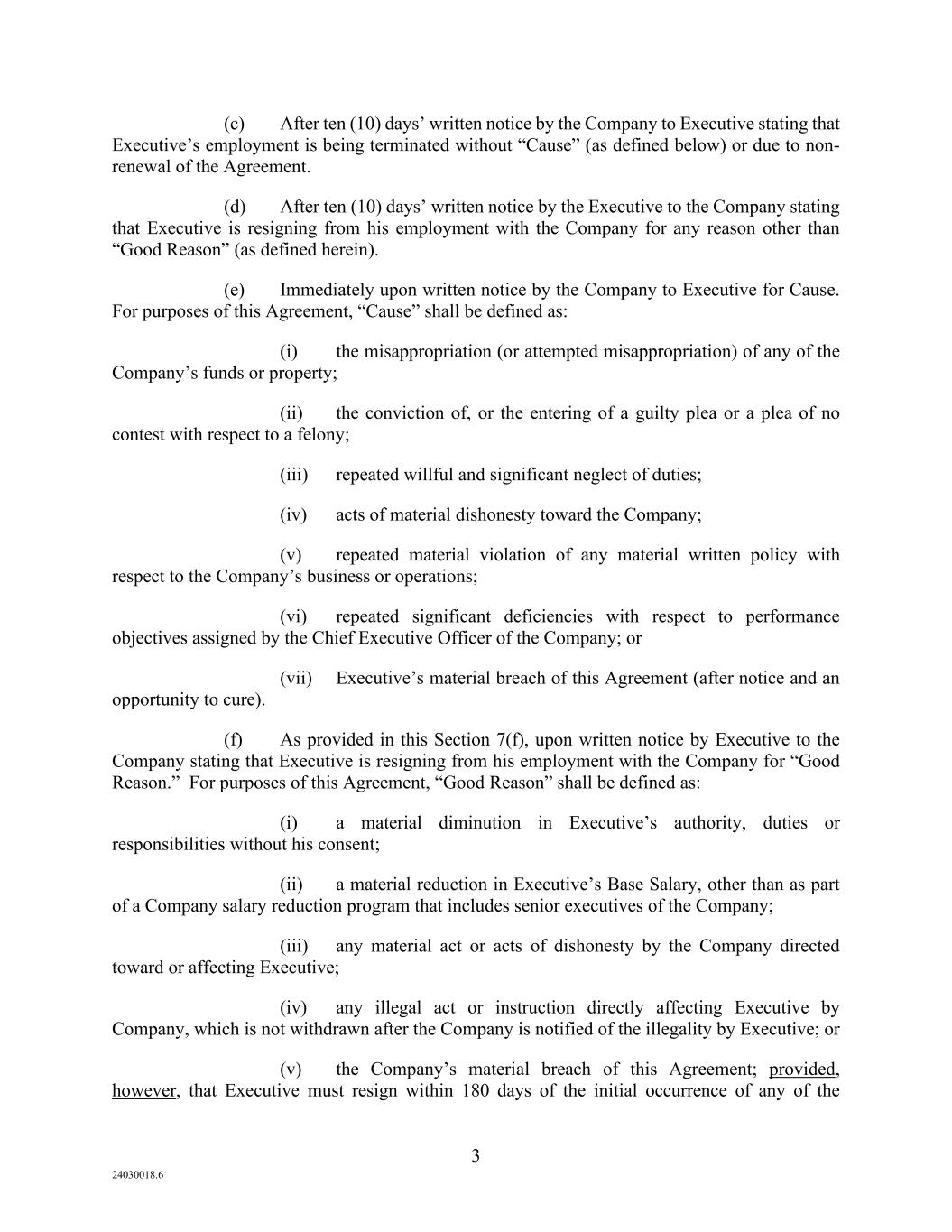 24030018.6 3 (c) After ten (10) days’ written notice by the Company to Executive stating that Executive’s employment is being terminated without “Cause” (as defined below) or due to non- renewal of the Agreement. (d) After ten (10) days’ written notice by the Executive to the Company stating that Executive is resigning from his employment with the Company for any reason other than “Good Reason” (as defined herein). (e) Immediately upon written notice by the Company to Executive for Cause. For purposes of this Agreement, “Cause” shall be defined as: (i) the misappropriation (or attempted misappropriation) of any of the Company’s funds or property; (ii) the conviction of, or the entering of a guilty plea or a plea of no contest with respect to a felony; (iii) repeated willful and significant neglect of duties; (iv) acts of material dishonesty toward the Company; (v) repeated material violation of any material written policy with respect to the Company’s business or operations; (vi) repeated significant deficiencies with respect to performance objectives assigned by the Chief Executive Officer of the Company; or (vii) Executive’s material breach of this Agreement (after notice and an opportunity to cure). (f) As provided in this Section 7(f), upon written notice by Executive to the Company stating that Executive is resigning from his employment with the Company for “Good Reason.” For purposes of this Agreement, “Good Reason” shall be defined as: (i) a material diminution in Executive’s authority, duties or responsibilities without his consent; (ii) a material reduction in Executive’s Base Salary, other than as part of a Company salary reduction program that includes senior executives of the Company; (iii) any material act or acts of dishonesty by the Company directed toward or affecting Executive; (iv) any illegal act or instruction directly affecting Executive by Company, which is not withdrawn after the Company is notified of the illegality by Executive; or (v) the Company’s material breach of this Agreement; provided, however, that Executive must resign within 180 days of the initial occurrence of any of the