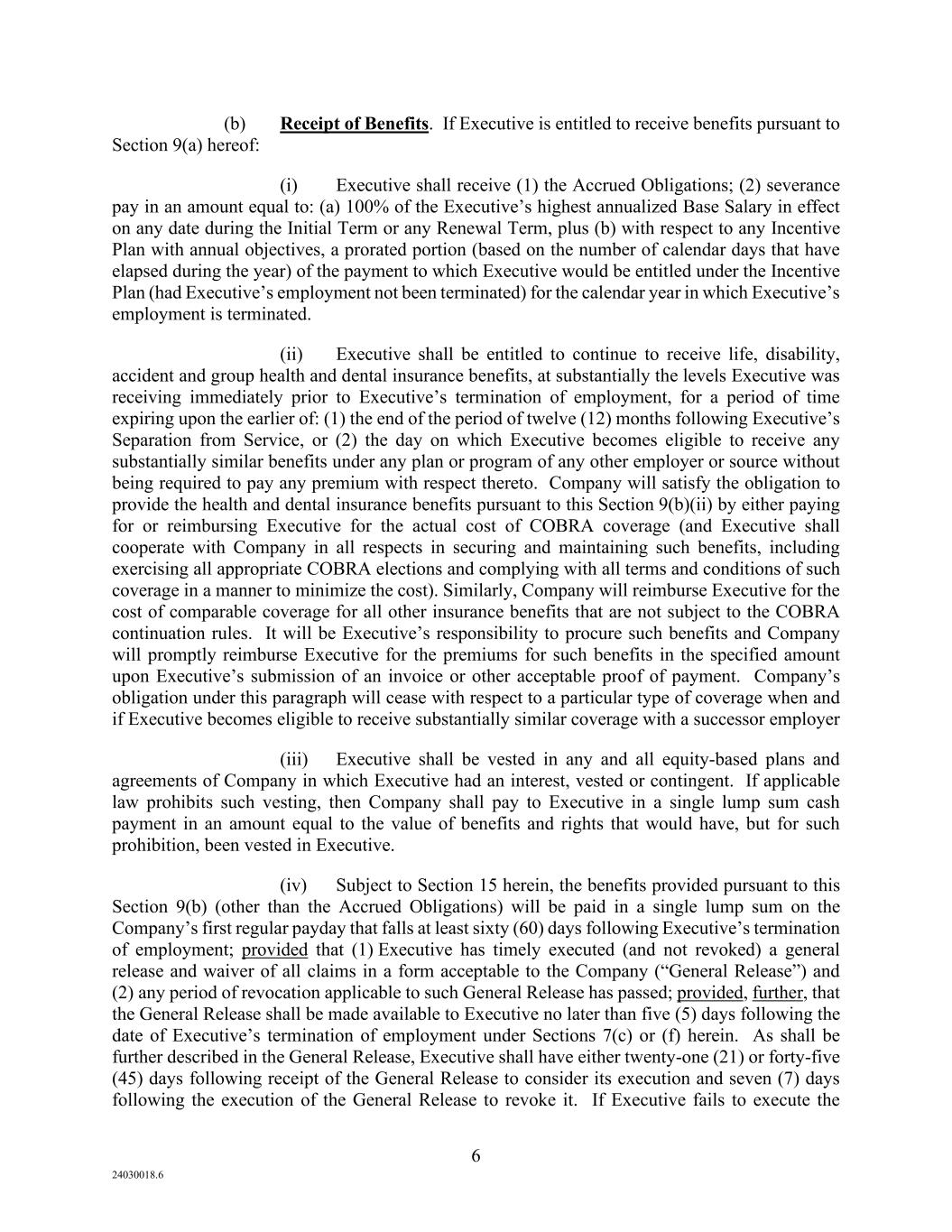 24030018.6 6 (b) Receipt of Benefits. If Executive is entitled to receive benefits pursuant to Section 9(a) hereof: (i) Executive shall receive (1) the Accrued Obligations; (2) severance pay in an amount equal to: (a) 100% of the Executive’s highest annualized Base Salary in effect on any date during the Initial Term or any Renewal Term, plus (b) with respect to any Incentive Plan with annual objectives, a prorated portion (based on the number of calendar days that have elapsed during the year) of the payment to which Executive would be entitled under the Incentive Plan (had Executive’s employment not been terminated) for the calendar year in which Executive’s employment is terminated. (ii) Executive shall be entitled to continue to receive life, disability, accident and group health and dental insurance benefits, at substantially the levels Executive was receiving immediately prior to Executive’s termination of employment, for a period of time expiring upon the earlier of: (1) the end of the period of twelve (12) months following Executive’s Separation from Service, or (2) the day on which Executive becomes eligible to receive any substantially similar benefits under any plan or program of any other employer or source without being required to pay any premium with respect thereto. Company will satisfy the obligation to provide the health and dental insurance benefits pursuant to this Section 9(b)(ii) by either paying for or reimbursing Executive for the actual cost of COBRA coverage (and Executive shall cooperate with Company in all respects in securing and maintaining such benefits, including exercising all appropriate COBRA elections and complying with all terms and conditions of such coverage in a manner to minimize the cost). Similarly, Company will reimburse Executive for the cost of comparable coverage for all other insurance benefits that are not subject to the COBRA continuation rules. It will be Executive’s responsibility to procure such benefits and Company will promptly reimburse Executive for the premiums for such benefits in the specified amount upon Executive’s submission of an invoice or other acceptable proof of payment. Company’s obligation under this paragraph will cease with respect to a particular type of coverage when and if Executive becomes eligible to receive substantially similar coverage with a successor employer (iii) Executive shall be vested in any and all equity-based plans and agreements of Company in which Executive had an interest, vested or contingent. If applicable law prohibits such vesting, then Company shall pay to Executive in a single lump sum cash payment in an amount equal to the value of benefits and rights that would have, but for such prohibition, been vested in Executive. (iv) Subject to Section 15 herein, the benefits provided pursuant to this Section 9(b) (other than the Accrued Obligations) will be paid in a single lump sum on the Company’s first regular payday that falls at least sixty (60) days following Executive’s termination of employment; provided that (1) Executive has timely executed (and not revoked) a general release and waiver of all claims in a form acceptable to the Company (“General Release”) and (2) any period of revocation applicable to such General Release has passed; provided, further, that the General Release shall be made available to Executive no later than five (5) days following the date of Executive’s termination of employment under Sections 7(c) or (f) herein. As shall be further described in the General Release, Executive shall have either twenty-one (21) or forty-five (45) days following receipt of the General Release to consider its execution and seven (7) days following the execution of the General Release to revoke it. If Executive fails to execute the
