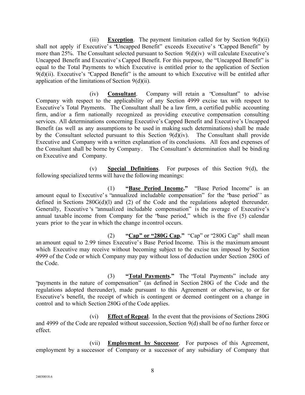 24030018.6 8 (iii) Exception. The payment limitation called for by Section 9(d)(ii) shall not apply if Executive’ s “Uncapped Benefit” exceeds Executive’ s “Capped Benefit” by more than 25%. The Consultant selected pursuant to Section 9(d)(iv) will calculate Executive’s Uncapped Benefit and Executive’ s Capped Benefit. For this purpose, the “Uncapped Benefit” is equal to the Total Payments to which Executive is entitled prior to the application of Section 9(d)(ii). Executive’s “Capped Benefit” is the amount to which Executive will be entitled after application of the limitations of Section 9(d)(ii). (iv) Consultant. Company will retain a “Consultant” to advise Company with respect to the applicability of any Section 4999 excise tax with respect to Executive’s Total Payments. The Consultant shall be a law firm, a certified public accounting firm, and/or a firm nationally recognized as providing executive compensation consulting services. All determinations concerning Executive’s Capped Benefit and Executive’s Uncapped Benefit (as well as any assumptions to be used in making such determinations) shall be made by the Consultant selected pursuant to this Section 9(d)(iv). The Consultant shall provide Executive and Company with a written explanation of its conclusions. All fees and expenses of the Consultant shall be borne by Company. The Consultant’s determination shall be binding on Executive and Company. (v) Special Definitions. For purposes of this Section 9(d), the following specialized terms will have the following meanings: (1) “Base Period Income.” “Base Period Income” is an amount equal to Executive’ s “annualized includable compensation” for the “base period’’ as defined in Sections 280G(d)(l) and (2) of the Code and the regulations adopted thereunder. Generally, Executive ‘s “annualized includable compensation” is the average of Executive’s annual taxable income from Company for the “base period,” which is the five (5) calendar years prior to the year in which the change in control occurs. (2) “Cap” or “280G Cap.” “Cap” or “280G Cap” shall mean an amount equal to 2.99 times Executive’ s Base Period Income. This is the maximum amount which Executive may receive without becoming subject to the excise tax imposed by Section 4999 of the Code or which Company may pay without loss of deduction under Section 280G of the Code. (3) “Total Payments.” The “Total Payments” include any “payments in the nature of compensation” (as defined in Section 280G of the Code and the regulations adopted thereunder), made pursuant to this Agreement or otherwise, to or for Executive’s benefit, the receipt of which is contingent or deemed contingent on a change in control and to which Section 280G of the Code applies. (vi) Effect of Repeal. In the event that the provisions of Sections 280G and 4999 of the Code are repealed without succession, Section 9(d) shall be of no further force or effect. (vii) Employment by Successor. For purposes of this Agreement, employment by a successor of Company or a successor of any subsidiary of Company that