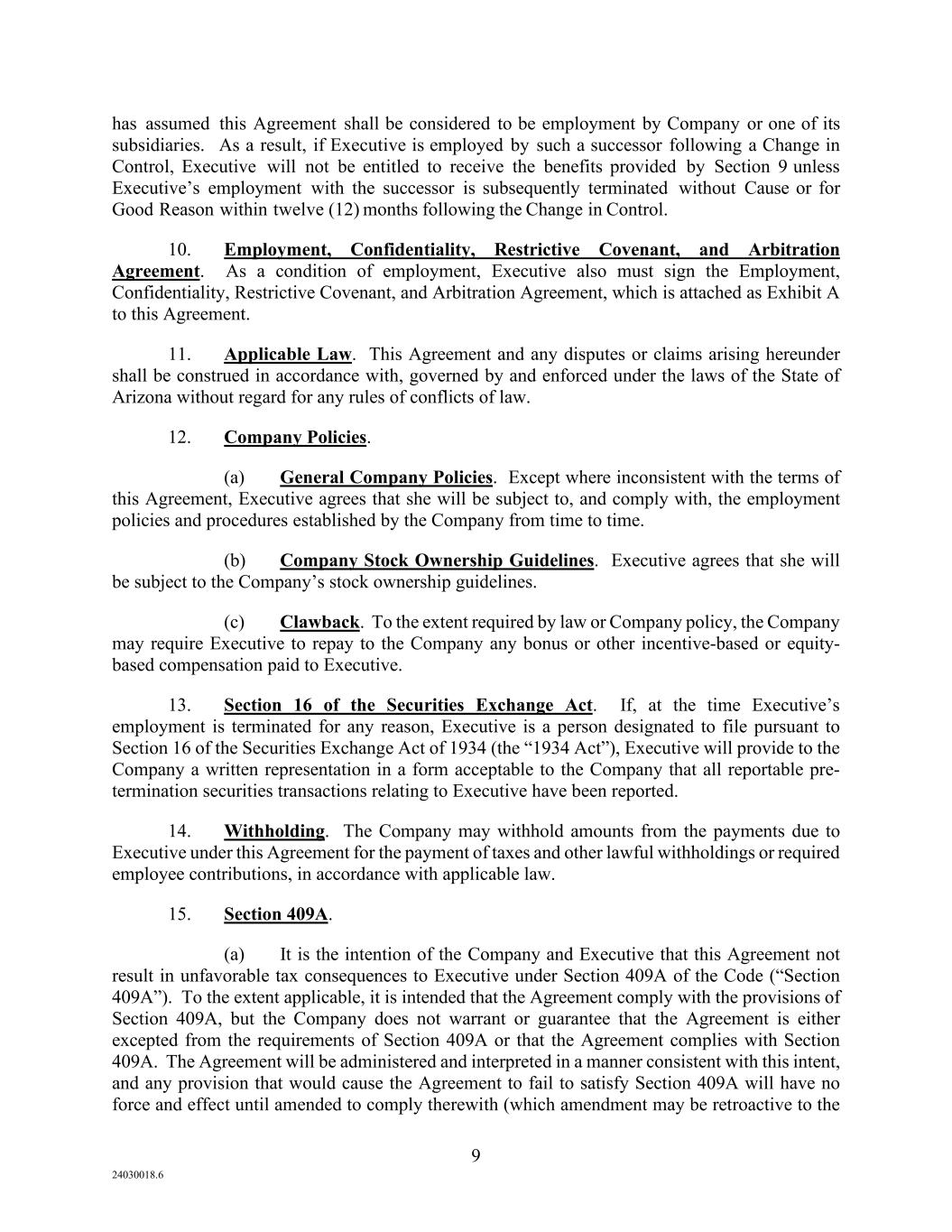 24030018.6 9 has assumed this Agreement shall be considered to be employment by Company or one of its subsidiaries. As a result, if Executive is employed by such a successor following a Change in Control, Executive will not be entitled to receive the benefits provided by Section 9 unless Executive’s employment with the successor is subsequently terminated without Cause or for Good Reason within twelve (12) months following the Change in Control. 10. Employment, Confidentiality, Restrictive Covenant, and Arbitration Agreement. As a condition of employment, Executive also must sign the Employment, Confidentiality, Restrictive Covenant, and Arbitration Agreement, which is attached as Exhibit A to this Agreement. 11. Applicable Law. This Agreement and any disputes or claims arising hereunder shall be construed in accordance with, governed by and enforced under the laws of the State of Arizona without regard for any rules of conflicts of law. 12. Company Policies. (a) General Company Policies. Except where inconsistent with the terms of this Agreement, Executive agrees that she will be subject to, and comply with, the employment policies and procedures established by the Company from time to time. (b) Company Stock Ownership Guidelines. Executive agrees that she will be subject to the Company’s stock ownership guidelines. (c) Clawback. To the extent required by law or Company policy, the Company may require Executive to repay to the Company any bonus or other incentive-based or equity- based compensation paid to Executive. 13. Section 16 of the Securities Exchange Act. If, at the time Executive’s employment is terminated for any reason, Executive is a person designated to file pursuant to Section 16 of the Securities Exchange Act of 1934 (the “1934 Act”), Executive will provide to the Company a written representation in a form acceptable to the Company that all reportable pre- termination securities transactions relating to Executive have been reported. 14. Withholding. The Company may withhold amounts from the payments due to Executive under this Agreement for the payment of taxes and other lawful withholdings or required employee contributions, in accordance with applicable law. 15. Section 409A. (a) It is the intention of the Company and Executive that this Agreement not result in unfavorable tax consequences to Executive under Section 409A of the Code (“Section 409A”). To the extent applicable, it is intended that the Agreement comply with the provisions of Section 409A, but the Company does not warrant or guarantee that the Agreement is either excepted from the requirements of Section 409A or that the Agreement complies with Section 409A. The Agreement will be administered and interpreted in a manner consistent with this intent, and any provision that would cause the Agreement to fail to satisfy Section 409A will have no force and effect until amended to comply therewith (which amendment may be retroactive to the