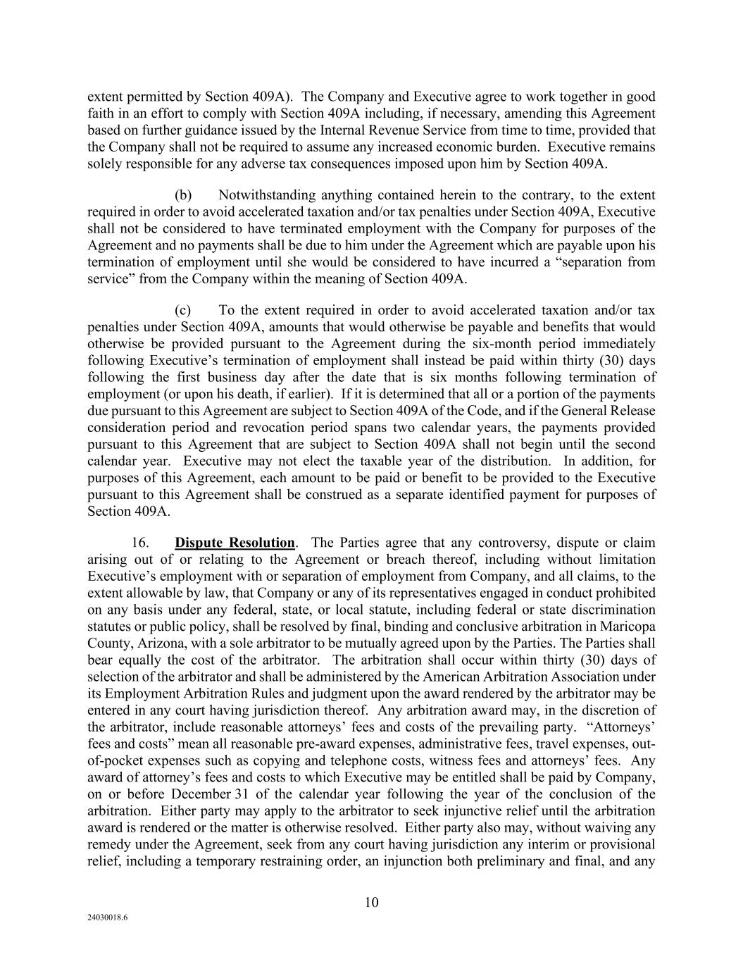 24030018.6 10 extent permitted by Section 409A). The Company and Executive agree to work together in good faith in an effort to comply with Section 409A including, if necessary, amending this Agreement based on further guidance issued by the Internal Revenue Service from time to time, provided that the Company shall not be required to assume any increased economic burden. Executive remains solely responsible for any adverse tax consequences imposed upon him by Section 409A. (b) Notwithstanding anything contained herein to the contrary, to the extent required in order to avoid accelerated taxation and/or tax penalties under Section 409A, Executive shall not be considered to have terminated employment with the Company for purposes of the Agreement and no payments shall be due to him under the Agreement which are payable upon his termination of employment until she would be considered to have incurred a “separation from service” from the Company within the meaning of Section 409A. (c) To the extent required in order to avoid accelerated taxation and/or tax penalties under Section 409A, amounts that would otherwise be payable and benefits that would otherwise be provided pursuant to the Agreement during the six-month period immediately following Executive’s termination of employment shall instead be paid within thirty (30) days following the first business day after the date that is six months following termination of employment (or upon his death, if earlier). If it is determined that all or a portion of the payments due pursuant to this Agreement are subject to Section 409A of the Code, and if the General Release consideration period and revocation period spans two calendar years, the payments provided pursuant to this Agreement that are subject to Section 409A shall not begin until the second calendar year. Executive may not elect the taxable year of the distribution. In addition, for purposes of this Agreement, each amount to be paid or benefit to be provided to the Executive pursuant to this Agreement shall be construed as a separate identified payment for purposes of Section 409A. 16. Dispute Resolution. The Parties agree that any controversy, dispute or claim arising out of or relating to the Agreement or breach thereof, including without limitation Executive’s employment with or separation of employment from Company, and all claims, to the extent allowable by law, that Company or any of its representatives engaged in conduct prohibited on any basis under any federal, state, or local statute, including federal or state discrimination statutes or public policy, shall be resolved by final, binding and conclusive arbitration in Maricopa County, Arizona, with a sole arbitrator to be mutually agreed upon by the Parties. The Parties shall bear equally the cost of the arbitrator. The arbitration shall occur within thirty (30) days of selection of the arbitrator and shall be administered by the American Arbitration Association under its Employment Arbitration Rules and judgment upon the award rendered by the arbitrator may be entered in any court having jurisdiction thereof. Any arbitration award may, in the discretion of the arbitrator, include reasonable attorneys’ fees and costs of the prevailing party. “Attorneys’ fees and costs” mean all reasonable pre-award expenses, administrative fees, travel expenses, out- of-pocket expenses such as copying and telephone costs, witness fees and attorneys’ fees. Any award of attorney’s fees and costs to which Executive may be entitled shall be paid by Company, on or before December 31 of the calendar year following the year of the conclusion of the arbitration. Either party may apply to the arbitrator to seek injunctive relief until the arbitration award is rendered or the matter is otherwise resolved. Either party also may, without waiving any remedy under the Agreement, seek from any court having jurisdiction any interim or provisional relief, including a temporary restraining order, an injunction both preliminary and final, and any