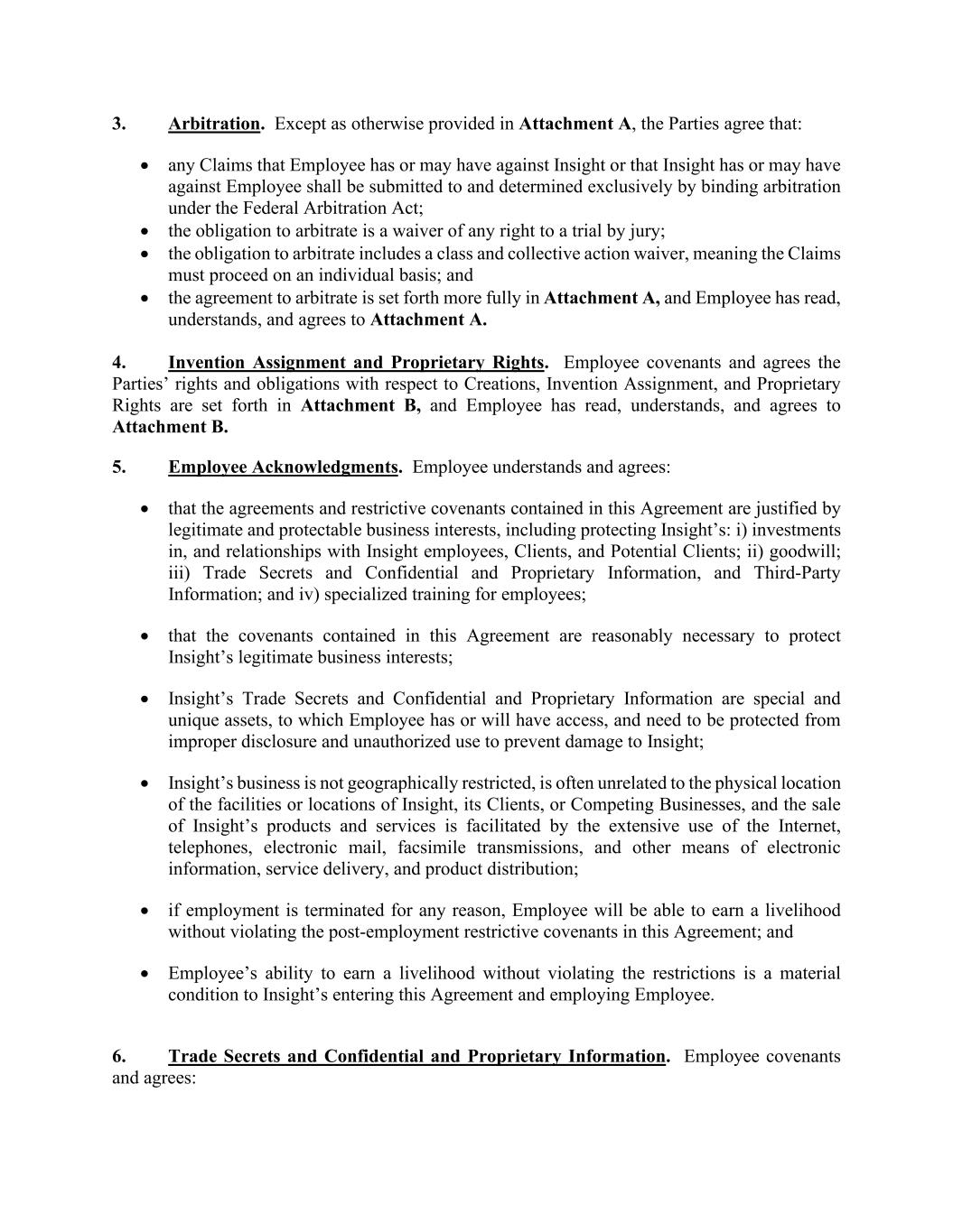 3. Arbitration. Except as otherwise provided in Attachment A, the Parties agree that: • any Claims that Employee has or may have against Insight or that Insight has or may have against Employee shall be submitted to and determined exclusively by binding arbitration under the Federal Arbitration Act; • the obligation to arbitrate is a waiver of any right to a trial by jury; • the obligation to arbitrate includes a class and collective action waiver, meaning the Claims must proceed on an individual basis; and • the agreement to arbitrate is set forth more fully in Attachment A, and Employee has read, understands, and agrees to Attachment A. 4. Invention Assignment and Proprietary Rights. Employee covenants and agrees the Parties’ rights and obligations with respect to Creations, Invention Assignment, and Proprietary Rights are set forth in Attachment B, and Employee has read, understands, and agrees to Attachment B. 5. Employee Acknowledgments. Employee understands and agrees: • that the agreements and restrictive covenants contained in this Agreement are justified by legitimate and protectable business interests, including protecting Insight’s: i) investments in, and relationships with Insight employees, Clients, and Potential Clients; ii) goodwill; iii) Trade Secrets and Confidential and Proprietary Information, and Third-Party Information; and iv) specialized training for employees; • that the covenants contained in this Agreement are reasonably necessary to protect Insight’s legitimate business interests; • Insight’s Trade Secrets and Confidential and Proprietary Information are special and unique assets, to which Employee has or will have access, and need to be protected from improper disclosure and unauthorized use to prevent damage to Insight; • Insight’s business is not geographically restricted, is often unrelated to the physical location of the facilities or locations of Insight, its Clients, or Competing Businesses, and the sale of Insight’s products and services is facilitated by the extensive use of the Internet, telephones, electronic mail, facsimile transmissions, and other means of electronic information, service delivery, and product distribution; • if employment is terminated for any reason, Employee will be able to earn a livelihood without violating the post-employment restrictive covenants in this Agreement; and • Employee’s ability to earn a livelihood without violating the restrictions is a material condition to Insight’s entering this Agreement and employing Employee. 6. Trade Secrets and Confidential and Proprietary Information. Employee covenants and agrees: