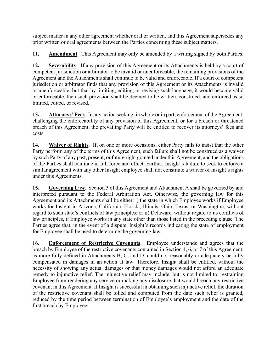 subject matter in any other agreement whether oral or written, and this Agreement supersedes any prior written or oral agreements between the Parties concerning these subject matters. 11. Amendment. This Agreement may only be amended by a writing signed by both Parties. 12. Severability. If any provision of this Agreement or its Attachments is held by a court of competent jurisdiction or arbitrator to be invalid or unenforceable, the remaining provisions of the Agreement and the Attachments shall continue to be valid and enforceable. If a court of competent jurisdiction or arbitrator finds that any provision of this Agreement or its Attachments is invalid or unenforceable, but that by limiting, editing, or revising such language, it would become valid or enforceable, then such provision shall be deemed to be written, construed, and enforced as so limited, edited, or revised. 13. Attorneys’ Fees. In any action seeking, in whole or in part, enforcement of the Agreement, challenging the enforceability of any provision of this Agreement, or for a breach or threatened breach of this Agreement, the prevailing Party will be entitled to recover its attorneys’ fees and costs. 14. Waiver of Rights. If, on one or more occasions, either Party fails to insist that the other Party perform any of the terms of this Agreement, such failure shall not be construed as a waiver by such Party of any past, present, or future right granted under this Agreement, and the obligations of the Parties shall continue in full force and effect. Further, Insight’s failure to seek to enforce a similar agreement with any other Insight employee shall not constitute a waiver of Insight’s rights under this Agreements. 15. Governing Law. Section 3 of this Agreement and Attachment A shall be governed by and interpreted pursuant to the Federal Arbitration Act. Otherwise, the governing law for this Agreement and its Attachments shall be either: i) the state in which Employee works if Employee works for Insight in Arizona, California, Florida, Illinois, Ohio, Texas, or Washington, without regard to such state’s conflicts of law principles; or ii) Delaware, without regard to its conflicts of law principles, if Employee works in any state other than those listed in the preceding clause. The Parties agree that, in the event of a dispute, Insight’s records indicating the state of employment for Employee shall be used to determine the governing law. 16. Enforcement of Restrictive Covenants. Employee understands and agrees that the breach by Employee of the restrictive covenants contained in Section 4, 6, or 7 of this Agreement, as more fully defined in Attachments B, C, and D, could not reasonably or adequately be fully compensated in damages in an action at law. Therefore, Insight shall be entitled, without the necessity of showing any actual damages or that money damages would not afford an adequate remedy to injunctive relief. The injunctive relief may include, but is not limited to, restraining Employee from rendering any service or making any disclosure that would breach any restrictive covenant in this Agreement. If Insight is successful in obtaining such injunctive relief, the duration of the restrictive covenant shall be tolled and computed from the date such relief is granted, reduced by the time period between termination of Employee’s employment and the date of the first breach by Employee.