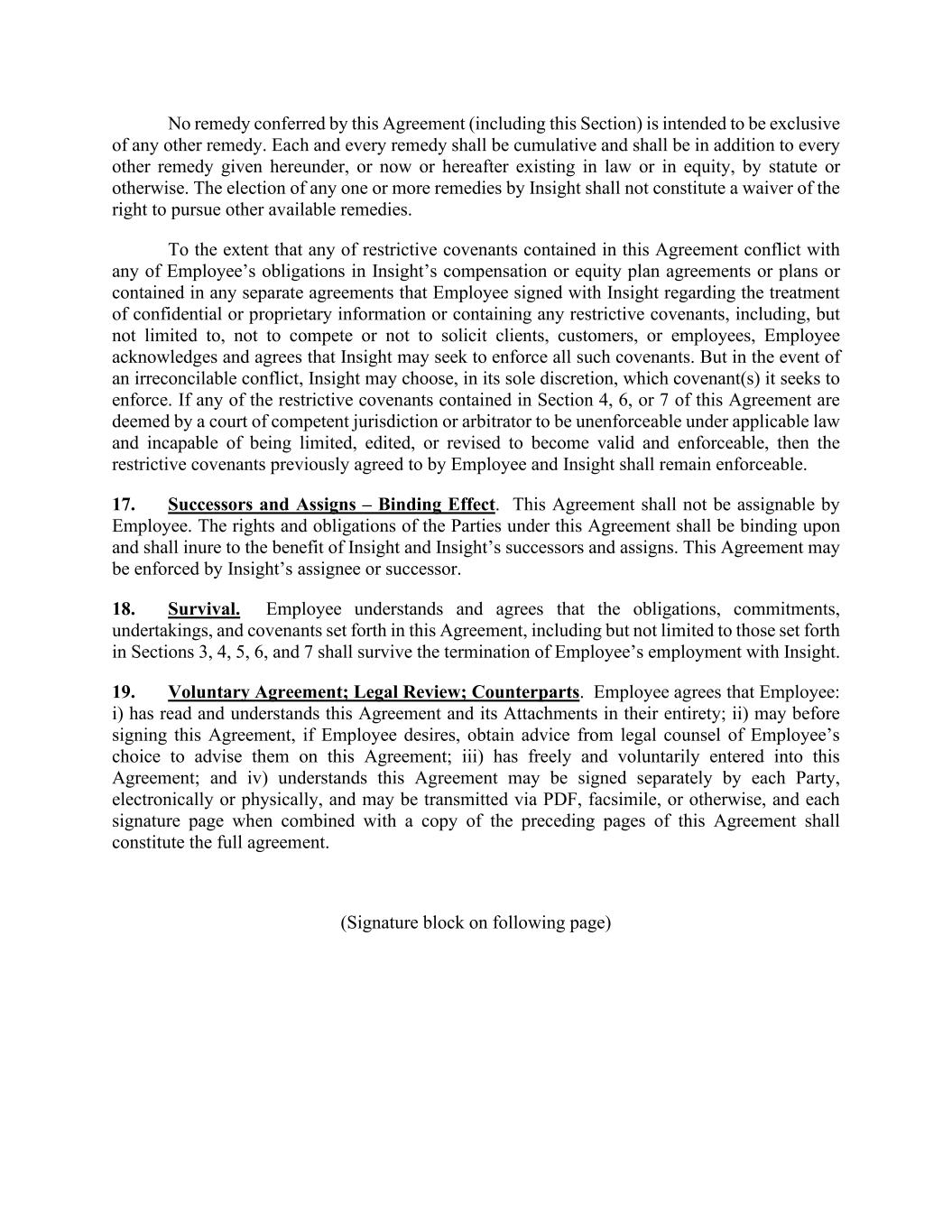 No remedy conferred by this Agreement (including this Section) is intended to be exclusive of any other remedy. Each and every remedy shall be cumulative and shall be in addition to every other remedy given hereunder, or now or hereafter existing in law or in equity, by statute or otherwise. The election of any one or more remedies by Insight shall not constitute a waiver of the right to pursue other available remedies. To the extent that any of restrictive covenants contained in this Agreement conflict with any of Employee’s obligations in Insight’s compensation or equity plan agreements or plans or contained in any separate agreements that Employee signed with Insight regarding the treatment of confidential or proprietary information or containing any restrictive covenants, including, but not limited to, not to compete or not to solicit clients, customers, or employees, Employee acknowledges and agrees that Insight may seek to enforce all such covenants. But in the event of an irreconcilable conflict, Insight may choose, in its sole discretion, which covenant(s) it seeks to enforce. If any of the restrictive covenants contained in Section 4, 6, or 7 of this Agreement are deemed by a court of competent jurisdiction or arbitrator to be unenforceable under applicable law and incapable of being limited, edited, or revised to become valid and enforceable, then the restrictive covenants previously agreed to by Employee and Insight shall remain enforceable. 17. Successors and Assigns – Binding Effect. This Agreement shall not be assignable by Employee. The rights and obligations of the Parties under this Agreement shall be binding upon and shall inure to the benefit of Insight and Insight’s successors and assigns. This Agreement may be enforced by Insight’s assignee or successor. 18. Survival. Employee understands and agrees that the obligations, commitments, undertakings, and covenants set forth in this Agreement, including but not limited to those set forth in Sections 3, 4, 5, 6, and 7 shall survive the termination of Employee’s employment with Insight. 19. Voluntary Agreement; Legal Review; Counterparts. Employee agrees that Employee: i) has read and understands this Agreement and its Attachments in their entirety; ii) may before signing this Agreement, if Employee desires, obtain advice from legal counsel of Employee’s choice to advise them on this Agreement; iii) has freely and voluntarily entered into this Agreement; and iv) understands this Agreement may be signed separately by each Party, electronically or physically, and may be transmitted via PDF, facsimile, or otherwise, and each signature page when combined with a copy of the preceding pages of this Agreement shall constitute the full agreement. (Signature block on following page)