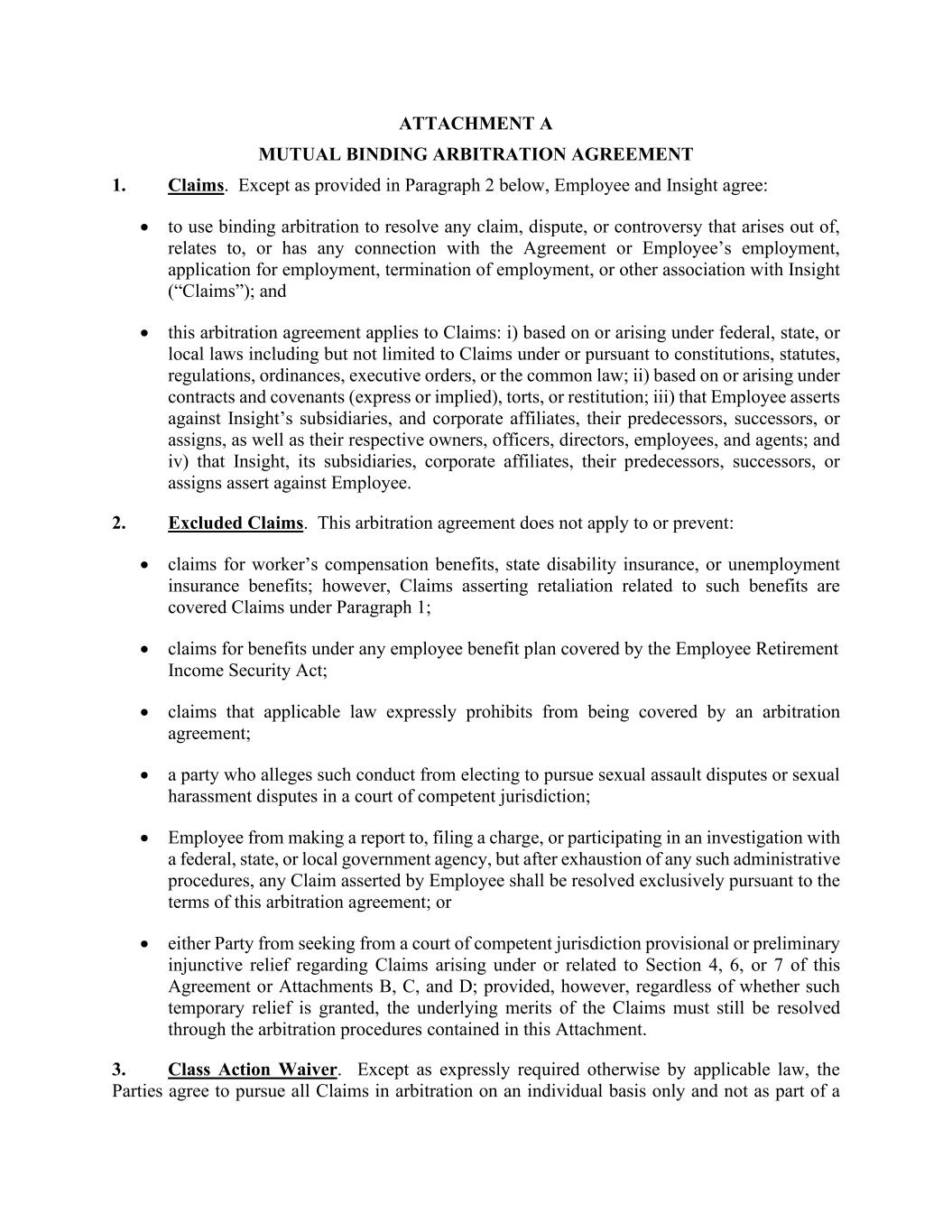 ATTACHMENT A MUTUAL BINDING ARBITRATION AGREEMENT 1. Claims. Except as provided in Paragraph 2 below, Employee and Insight agree: • to use binding arbitration to resolve any claim, dispute, or controversy that arises out of, relates to, or has any connection with the Agreement or Employee’s employment, application for employment, termination of employment, or other association with Insight (“Claims”); and • this arbitration agreement applies to Claims: i) based on or arising under federal, state, or local laws including but not limited to Claims under or pursuant to constitutions, statutes, regulations, ordinances, executive orders, or the common law; ii) based on or arising under contracts and covenants (express or implied), torts, or restitution; iii) that Employee asserts against Insight’s subsidiaries, and corporate affiliates, their predecessors, successors, or assigns, as well as their respective owners, officers, directors, employees, and agents; and iv) that Insight, its subsidiaries, corporate affiliates, their predecessors, successors, or assigns assert against Employee. 2. Excluded Claims. This arbitration agreement does not apply to or prevent: • claims for worker’s compensation benefits, state disability insurance, or unemployment insurance benefits; however, Claims asserting retaliation related to such benefits are covered Claims under Paragraph 1; • claims for benefits under any employee benefit plan covered by the Employee Retirement Income Security Act; • claims that applicable law expressly prohibits from being covered by an arbitration agreement; • a party who alleges such conduct from electing to pursue sexual assault disputes or sexual harassment disputes in a court of competent jurisdiction; • Employee from making a report to, filing a charge, or participating in an investigation with a federal, state, or local government agency, but after exhaustion of any such administrative procedures, any Claim asserted by Employee shall be resolved exclusively pursuant to the terms of this arbitration agreement; or • either Party from seeking from a court of competent jurisdiction provisional or preliminary injunctive relief regarding Claims arising under or related to Section 4, 6, or 7 of this Agreement or Attachments B, C, and D; provided, however, regardless of whether such temporary relief is granted, the underlying merits of the Claims must still be resolved through the arbitration procedures contained in this Attachment. 3. Class Action Waiver. Except as expressly required otherwise by applicable law, the Parties agree to pursue all Claims in arbitration on an individual basis only and not as part of a