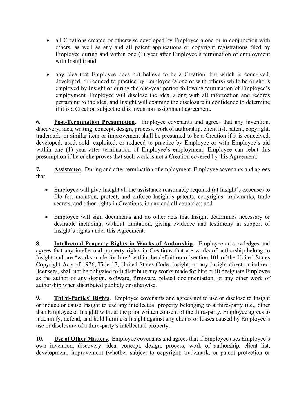 • all Creations created or otherwise developed by Employee alone or in conjunction with others, as well as any and all patent applications or copyright registrations filed by Employee during and within one (1) year after Employee’s termination of employment with Insight; and • any idea that Employee does not believe to be a Creation, but which is conceived, developed, or reduced to practice by Employee (alone or with others) while he or she is employed by Insight or during the one-year period following termination of Employee’s employment. Employee will disclose the idea, along with all information and records pertaining to the idea, and Insight will examine the disclosure in confidence to determine if it is a Creation subject to this invention assignment agreement. 6. Post-Termination Presumption. Employee covenants and agrees that any invention, discovery, idea, writing, concept, design, process, work of authorship, client list, patent, copyright, trademark, or similar item or improvement shall be presumed to be a Creation if it is conceived, developed, used, sold, exploited, or reduced to practice by Employee or with Employee’s aid within one (1) year after termination of Employee’s employment. Employee can rebut this presumption if he or she proves that such work is not a Creation covered by this Agreement. 7. Assistance. During and after termination of employment, Employee covenants and agrees that: • Employee will give Insight all the assistance reasonably required (at Insight’s expense) to file for, maintain, protect, and enforce Insight’s patents, copyrights, trademarks, trade secrets, and other rights in Creations, in any and all countries; and • Employee will sign documents and do other acts that Insight determines necessary or desirable including, without limitation, giving evidence and testimony in support of Insight’s rights under this Agreement. 8. Intellectual Property Rights in Works of Authorship. Employee acknowledges and agrees that any intellectual property rights in Creations that are works of authorship belong to Insight and are “works made for hire” within the definition of section 101 of the United States Copyright Acts of 1976, Title 17, United States Code. Insight, or any Insight direct or indirect licensees, shall not be obligated to i) distribute any works made for hire or ii) designate Employee as the author of any design, software, firmware, related documentation, or any other work of authorship when distributed publicly or otherwise. 9. Third-Parties’ Rights. Employee covenants and agrees not to use or disclose to Insight or induce or cause Insight to use any intellectual property belonging to a third-party (i.e., other than Employee or Insight) without the prior written consent of the third-party. Employee agrees to indemnify, defend, and hold harmless Insight against any claims or losses caused by Employee’s use or disclosure of a third-party’s intellectual property. 10. Use of Other Matters. Employee covenants and agrees that if Employee uses Employee’s own invention, discovery, idea, concept, design, process, work of authorship, client list, development, improvement (whether subject to copyright, trademark, or patent protection or
