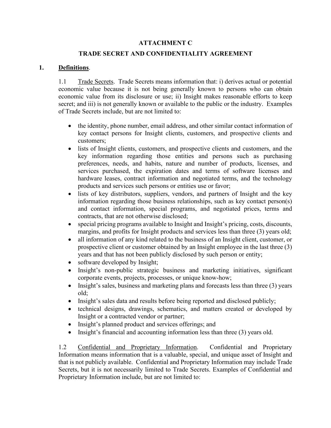 ATTACHMENT C TRADE SECRET AND CONFIDENTIALITY AGREEMENT 1. Definitions. 1.1 Trade Secrets. Trade Secrets means information that: i) derives actual or potential economic value because it is not being generally known to persons who can obtain economic value from its disclosure or use; ii) Insight makes reasonable efforts to keep secret; and iii) is not generally known or available to the public or the industry. Examples of Trade Secrets include, but are not limited to: • the identity, phone number, email address, and other similar contact information of key contact persons for Insight clients, customers, and prospective clients and customers; • lists of Insight clients, customers, and prospective clients and customers, and the key information regarding those entities and persons such as purchasing preferences, needs, and habits, nature and number of products, licenses, and services purchased, the expiration dates and terms of software licenses and hardware leases, contract information and negotiated terms, and the technology products and services such persons or entities use or favor; • lists of key distributors, suppliers, vendors, and partners of Insight and the key information regarding those business relationships, such as key contact person(s) and contact information, special programs, and negotiated prices, terms and contracts, that are not otherwise disclosed; • special pricing programs available to Insight and Insight’s pricing, costs, discounts, margins, and profits for Insight products and services less than three (3) years old; • all information of any kind related to the business of an Insight client, customer, or prospective client or customer obtained by an Insight employee in the last three (3) years and that has not been publicly disclosed by such person or entity; • software developed by Insight; • Insight’s non-public strategic business and marketing initiatives, significant corporate events, projects, processes, or unique know-how; • Insight’s sales, business and marketing plans and forecasts less than three (3) years old; • Insight’s sales data and results before being reported and disclosed publicly; • technical designs, drawings, schematics, and matters created or developed by Insight or a contracted vendor or partner; • Insight’s planned product and services offerings; and • Insight’s financial and accounting information less than three (3) years old. 1.2 Confidential and Proprietary Information. Confidential and Proprietary Information means information that is a valuable, special, and unique asset of Insight and that is not publicly available. Confidential and Proprietary Information may include Trade Secrets, but it is not necessarily limited to Trade Secrets. Examples of Confidential and Proprietary Information include, but are not limited to:
