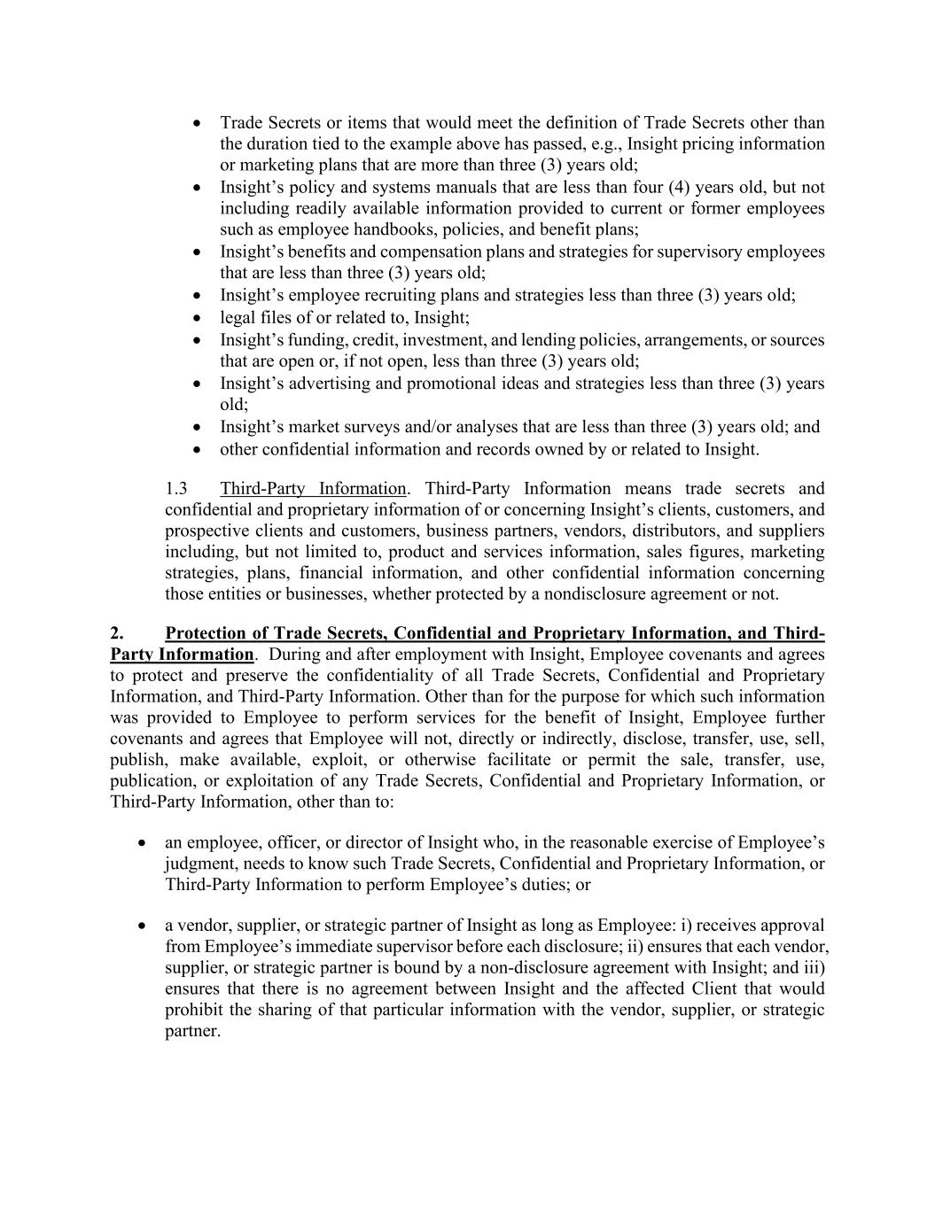 • Trade Secrets or items that would meet the definition of Trade Secrets other than the duration tied to the example above has passed, e.g., Insight pricing information or marketing plans that are more than three (3) years old; • Insight’s policy and systems manuals that are less than four (4) years old, but not including readily available information provided to current or former employees such as employee handbooks, policies, and benefit plans; • Insight’s benefits and compensation plans and strategies for supervisory employees that are less than three (3) years old; • Insight’s employee recruiting plans and strategies less than three (3) years old; • legal files of or related to, Insight; • Insight’s funding, credit, investment, and lending policies, arrangements, or sources that are open or, if not open, less than three (3) years old; • Insight’s advertising and promotional ideas and strategies less than three (3) years old; • Insight’s market surveys and/or analyses that are less than three (3) years old; and • other confidential information and records owned by or related to Insight. 1.3 Third-Party Information. Third-Party Information means trade secrets and confidential and proprietary information of or concerning Insight’s clients, customers, and prospective clients and customers, business partners, vendors, distributors, and suppliers including, but not limited to, product and services information, sales figures, marketing strategies, plans, financial information, and other confidential information concerning those entities or businesses, whether protected by a nondisclosure agreement or not. 2. Protection of Trade Secrets, Confidential and Proprietary Information, and Third- Party Information. During and after employment with Insight, Employee covenants and agrees to protect and preserve the confidentiality of all Trade Secrets, Confidential and Proprietary Information, and Third-Party Information. Other than for the purpose for which such information was provided to Employee to perform services for the benefit of Insight, Employee further covenants and agrees that Employee will not, directly or indirectly, disclose, transfer, use, sell, publish, make available, exploit, or otherwise facilitate or permit the sale, transfer, use, publication, or exploitation of any Trade Secrets, Confidential and Proprietary Information, or Third-Party Information, other than to: • an employee, officer, or director of Insight who, in the reasonable exercise of Employee’s judgment, needs to know such Trade Secrets, Confidential and Proprietary Information, or Third-Party Information to perform Employee’s duties; or • a vendor, supplier, or strategic partner of Insight as long as Employee: i) receives approval from Employee’s immediate supervisor before each disclosure; ii) ensures that each vendor, supplier, or strategic partner is bound by a non-disclosure agreement with Insight; and iii) ensures that there is no agreement between Insight and the affected Client that would prohibit the sharing of that particular information with the vendor, supplier, or strategic partner.