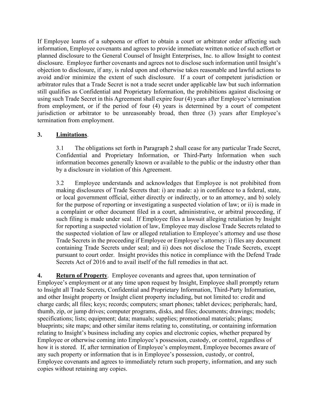If Employee learns of a subpoena or effort to obtain a court or arbitrator order affecting such information, Employee covenants and agrees to provide immediate written notice of such effort or planned disclosure to the General Counsel of Insight Enterprises, Inc. to allow Insight to contest disclosure. Employee further covenants and agrees not to disclose such information until Insight’s objection to disclosure, if any, is ruled upon and otherwise takes reasonable and lawful actions to avoid and/or minimize the extent of such disclosure. If a court of competent jurisdiction or arbitrator rules that a Trade Secret is not a trade secret under applicable law but such information still qualifies as Confidential and Proprietary Information, the prohibitions against disclosing or using such Trade Secret in this Agreement shall expire four (4) years after Employee’s termination from employment, or if the period of four (4) years is determined by a court of competent jurisdiction or arbitrator to be unreasonably broad, then three (3) years after Employee’s termination from employment. 3. Limitations. 3.1 The obligations set forth in Paragraph 2 shall cease for any particular Trade Secret, Confidential and Proprietary Information, or Third-Party Information when such information becomes generally known or available to the public or the industry other than by a disclosure in violation of this Agreement. 3.2 Employee understands and acknowledges that Employee is not prohibited from making disclosures of Trade Secrets that: i) are made: a) in confidence to a federal, state, or local government official, either directly or indirectly, or to an attorney, and b) solely for the purpose of reporting or investigating a suspected violation of law; or ii) is made in a complaint or other document filed in a court, administrative, or arbitral proceeding, if such filing is made under seal. If Employee files a lawsuit alleging retaliation by Insight for reporting a suspected violation of law, Employee may disclose Trade Secrets related to the suspected violation of law or alleged retaliation to Employee’s attorney and use those Trade Secrets in the proceeding if Employee or Employee’s attorney: i) files any document containing Trade Secrets under seal; and ii) does not disclose the Trade Secrets, except pursuant to court order. Insight provides this notice in compliance with the Defend Trade Secrets Act of 2016 and to avail itself of the full remedies in that act. 4. Return of Property. Employee covenants and agrees that, upon termination of Employee’s employment or at any time upon request by Insight, Employee shall promptly return to Insight all Trade Secrets, Confidential and Proprietary Information, Third-Party Information, and other Insight property or Insight client property including, but not limited to: credit and charge cards; all files; keys; records; computers; smart phones; tablet devices; peripherals; hard, thumb, zip, or jump drives; computer programs, disks, and files; documents; drawings; models; specifications; lists; equipment; data; manuals; supplies; promotional materials; plans; blueprints; site maps; and other similar items relating to, constituting, or containing information relating to Insight’s business including any copies and electronic copies, whether prepared by Employee or otherwise coming into Employee’s possession, custody, or control, regardless of how it is stored. If, after termination of Employee’s employment, Employee becomes aware of any such property or information that is in Employee’s possession, custody, or control, Employee covenants and agrees to immediately return such property, information, and any such copies without retaining any copies.