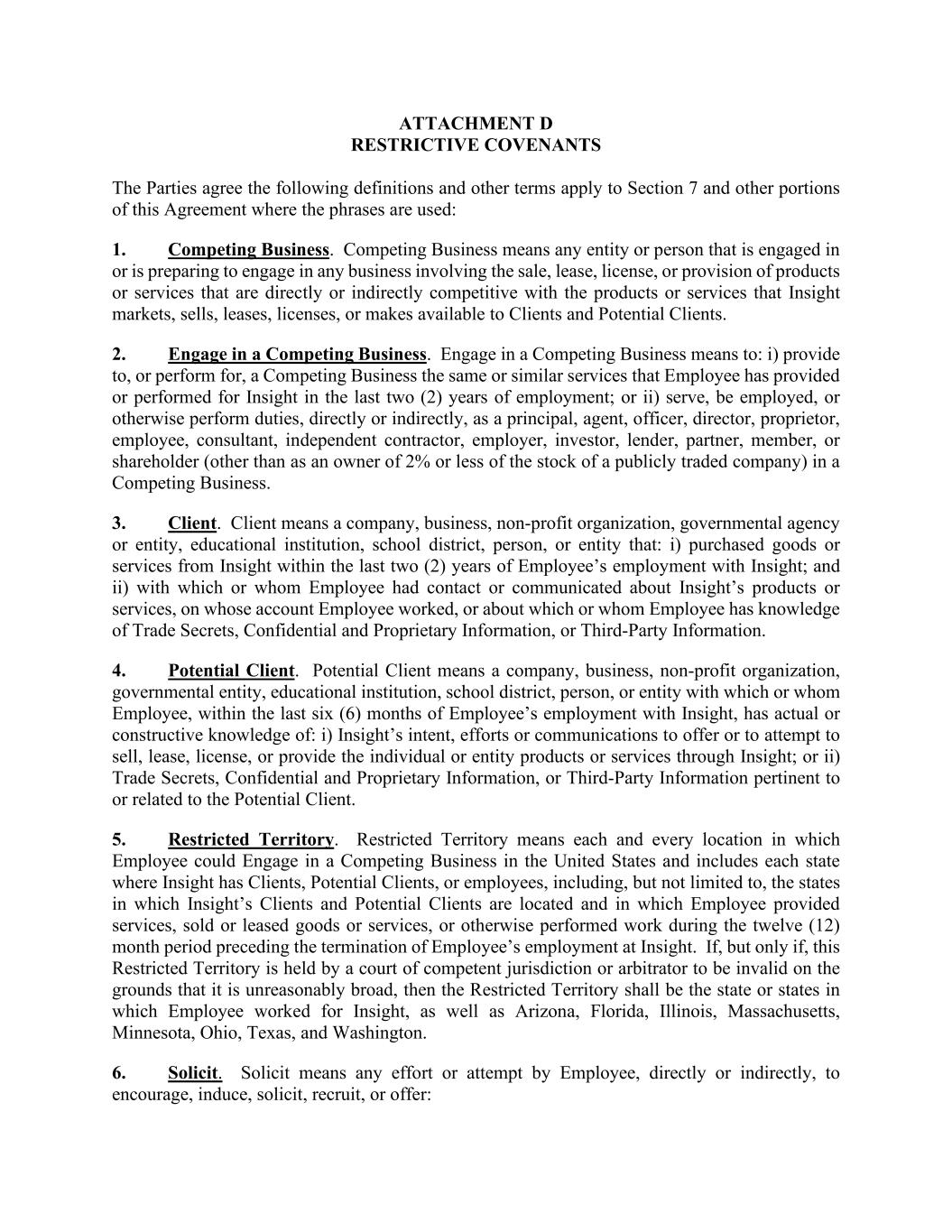 ATTACHMENT D RESTRICTIVE COVENANTS The Parties agree the following definitions and other terms apply to Section 7 and other portions of this Agreement where the phrases are used: 1. Competing Business. Competing Business means any entity or person that is engaged in or is preparing to engage in any business involving the sale, lease, license, or provision of products or services that are directly or indirectly competitive with the products or services that Insight markets, sells, leases, licenses, or makes available to Clients and Potential Clients. 2. Engage in a Competing Business. Engage in a Competing Business means to: i) provide to, or perform for, a Competing Business the same or similar services that Employee has provided or performed for Insight in the last two (2) years of employment; or ii) serve, be employed, or otherwise perform duties, directly or indirectly, as a principal, agent, officer, director, proprietor, employee, consultant, independent contractor, employer, investor, lender, partner, member, or shareholder (other than as an owner of 2% or less of the stock of a publicly traded company) in a Competing Business. 3. Client. Client means a company, business, non-profit organization, governmental agency or entity, educational institution, school district, person, or entity that: i) purchased goods or services from Insight within the last two (2) years of Employee’s employment with Insight; and ii) with which or whom Employee had contact or communicated about Insight’s products or services, on whose account Employee worked, or about which or whom Employee has knowledge of Trade Secrets, Confidential and Proprietary Information, or Third-Party Information. 4. Potential Client. Potential Client means a company, business, non-profit organization, governmental entity, educational institution, school district, person, or entity with which or whom Employee, within the last six (6) months of Employee’s employment with Insight, has actual or constructive knowledge of: i) Insight’s intent, efforts or communications to offer or to attempt to sell, lease, license, or provide the individual or entity products or services through Insight; or ii) Trade Secrets, Confidential and Proprietary Information, or Third-Party Information pertinent to or related to the Potential Client. 5. Restricted Territory. Restricted Territory means each and every location in which Employee could Engage in a Competing Business in the United States and includes each state where Insight has Clients, Potential Clients, or employees, including, but not limited to, the states in which Insight’s Clients and Potential Clients are located and in which Employee provided services, sold or leased goods or services, or otherwise performed work during the twelve (12) month period preceding the termination of Employee’s employment at Insight. If, but only if, this Restricted Territory is held by a court of competent jurisdiction or arbitrator to be invalid on the grounds that it is unreasonably broad, then the Restricted Territory shall be the state or states in which Employee worked for Insight, as well as Arizona, Florida, Illinois, Massachusetts, Minnesota, Ohio, Texas, and Washington. 6. Solicit. Solicit means any effort or attempt by Employee, directly or indirectly, to encourage, induce, solicit, recruit, or offer: