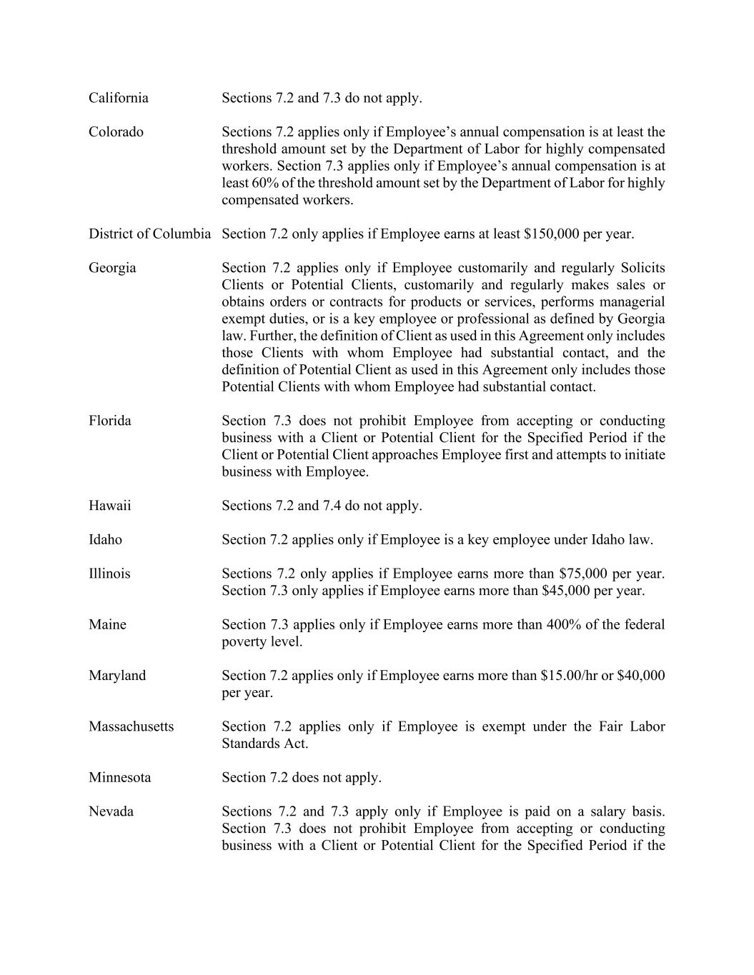 California Sections 7.2 and 7.3 do not apply. Colorado Sections 7.2 applies only if Employee’s annual compensation is at least the threshold amount set by the Department of Labor for highly compensated workers. Section 7.3 applies only if Employee’s annual compensation is at least 60% of the threshold amount set by the Department of Labor for highly compensated workers. District of Columbia Section 7.2 only applies if Employee earns at least $150,000 per year. Georgia Section 7.2 applies only if Employee customarily and regularly Solicits Clients or Potential Clients, customarily and regularly makes sales or obtains orders or contracts for products or services, performs managerial exempt duties, or is a key employee or professional as defined by Georgia law. Further, the definition of Client as used in this Agreement only includes those Clients with whom Employee had substantial contact, and the definition of Potential Client as used in this Agreement only includes those Potential Clients with whom Employee had substantial contact. Florida Section 7.3 does not prohibit Employee from accepting or conducting business with a Client or Potential Client for the Specified Period if the Client or Potential Client approaches Employee first and attempts to initiate business with Employee. Hawaii Sections 7.2 and 7.4 do not apply. Idaho Section 7.2 applies only if Employee is a key employee under Idaho law. Illinois Sections 7.2 only applies if Employee earns more than $75,000 per year. Section 7.3 only applies if Employee earns more than $45,000 per year. Maine Section 7.3 applies only if Employee earns more than 400% of the federal poverty level. Maryland Section 7.2 applies only if Employee earns more than $15.00/hr or $40,000 per year. Massachusetts Section 7.2 applies only if Employee is exempt under the Fair Labor Standards Act. Minnesota Section 7.2 does not apply. Nevada Sections 7.2 and 7.3 apply only if Employee is paid on a salary basis. Section 7.3 does not prohibit Employee from accepting or conducting business with a Client or Potential Client for the Specified Period if the