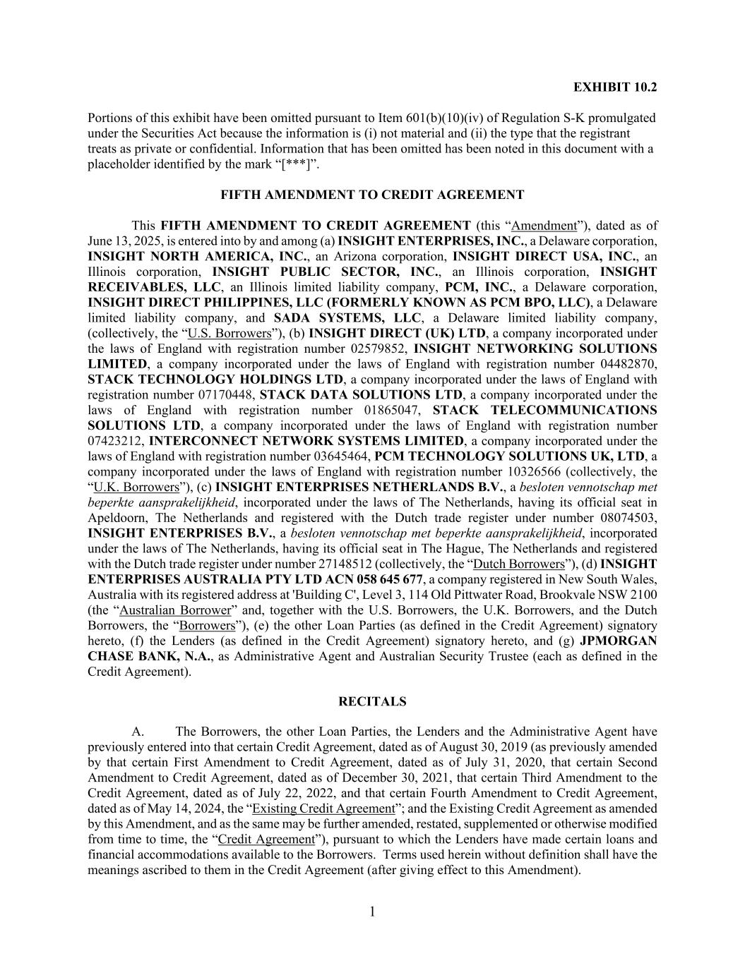 1 EXHIBIT 10.2 Portions of this exhibit have been omitted pursuant to Item 601(b)(10)(iv) of Regulation S-K promulgated under the Securities Act because the information is (i) not material and (ii) the type that the registrant treats as private or confidential. Information that has been omitted has been noted in this document with a placeholder identified by the mark “[***]”. FIFTH AMENDMENT TO CREDIT AGREEMENT This FIFTH AMENDMENT TO CREDIT AGREEMENT (this “Amendment”), dated as of June 13, 2025, is entered into by and among (a) INSIGHT ENTERPRISES, INC., a Delaware corporation, INSIGHT NORTH AMERICA, INC., an Arizona corporation, INSIGHT DIRECT USA, INC., an Illinois corporation, INSIGHT PUBLIC SECTOR, INC., an Illinois corporation, INSIGHT RECEIVABLES, LLC, an Illinois limited liability company, PCM, INC., a Delaware corporation, INSIGHT DIRECT PHILIPPINES, LLC (FORMERLY KNOWN AS PCM BPO, LLC), a Delaware limited liability company, and SADA SYSTEMS, LLC, a Delaware limited liability company, (collectively, the “U.S. Borrowers”), (b) INSIGHT DIRECT (UK) LTD, a company incorporated under the laws of England with registration number 02579852, INSIGHT NETWORKING SOLUTIONS LIMITED, a company incorporated under the laws of England with registration number 04482870, STACK TECHNOLOGY HOLDINGS LTD, a company incorporated under the laws of England with registration number 07170448, STACK DATA SOLUTIONS LTD, a company incorporated under the laws of England with registration number 01865047, STACK TELECOMMUNICATIONS SOLUTIONS LTD, a company incorporated under the laws of England with registration number 07423212, INTERCONNECT NETWORK SYSTEMS LIMITED, a company incorporated under the laws of England with registration number 03645464, PCM TECHNOLOGY SOLUTIONS UK, LTD, a company incorporated under the laws of England with registration number 10326566 (collectively, the “U.K. Borrowers”), (c) INSIGHT ENTERPRISES NETHERLANDS B.V., a besloten vennotschap met beperkte aansprakelijkheid, incorporated under the laws of The Netherlands, having its official seat in Apeldoorn, The Netherlands and registered with the Dutch trade register under number 08074503, INSIGHT ENTERPRISES B.V., a besloten vennotschap met beperkte aansprakelijkheid, incorporated under the laws of The Netherlands, having its official seat in The Hague, The Netherlands and registered with the Dutch trade register under number 27148512 (collectively, the “Dutch Borrowers”), (d) INSIGHT ENTERPRISES AUSTRALIA PTY LTD ACN 058 645 677, a company registered in New South Wales, Australia with its registered address at 'Building C', Level 3, 114 Old Pittwater Road, Brookvale NSW 2100 (the “Australian Borrower” and, together with the U.S. Borrowers, the U.K. Borrowers, and the Dutch Borrowers, the “Borrowers”), (e) the other Loan Parties (as defined in the Credit Agreement) signatory hereto, (f) the Lenders (as defined in the Credit Agreement) signatory hereto, and (g) JPMORGAN CHASE BANK, N.A., as Administrative Agent and Australian Security Trustee (each as defined in the Credit Agreement). RECITALS A. The Borrowers, the other Loan Parties, the Lenders and the Administrative Agent have previously entered into that certain Credit Agreement, dated as of August 30, 2019 (as previously amended by that certain First Amendment to Credit Agreement, dated as of July 31, 2020, that certain Second Amendment to Credit Agreement, dated as of December 30, 2021, that certain Third Amendment to the Credit Agreement, dated as of July 22, 2022, and that certain Fourth Amendment to Credit Agreement, dated as of May 14, 2024, the “Existing Credit Agreement”; and the Existing Credit Agreement as amended by this Amendment, and as the same may be further amended, restated, supplemented or otherwise modified from time to time, the “Credit Agreement”), pursuant to which the Lenders have made certain loans and financial accommodations available to the Borrowers. Terms used herein without definition shall have the meanings ascribed to them in the Credit Agreement (after giving effect to this Amendment).