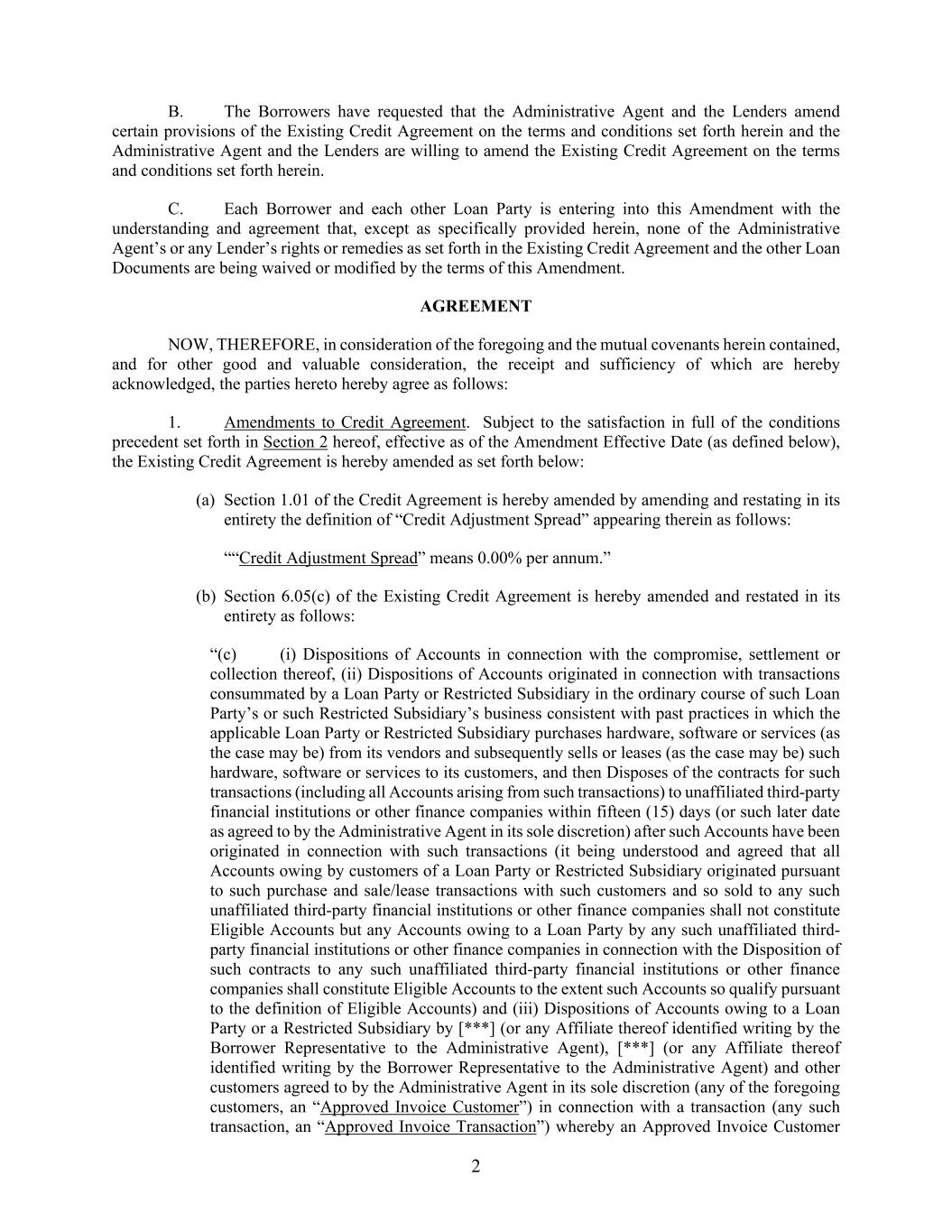 2 B. The Borrowers have requested that the Administrative Agent and the Lenders amend certain provisions of the Existing Credit Agreement on the terms and conditions set forth herein and the Administrative Agent and the Lenders are willing to amend the Existing Credit Agreement on the terms and conditions set forth herein. C. Each Borrower and each other Loan Party is entering into this Amendment with the understanding and agreement that, except as specifically provided herein, none of the Administrative Agent’s or any Lender’s rights or remedies as set forth in the Existing Credit Agreement and the other Loan Documents are being waived or modified by the terms of this Amendment. AGREEMENT NOW, THEREFORE, in consideration of the foregoing and the mutual covenants herein contained, and for other good and valuable consideration, the receipt and sufficiency of which are hereby acknowledged, the parties hereto hereby agree as follows: 1. Amendments to Credit Agreement. Subject to the satisfaction in full of the conditions precedent set forth in Section 2 hereof, effective as of the Amendment Effective Date (as defined below), the Existing Credit Agreement is hereby amended as set forth below: (a) Section 1.01 of the Credit Agreement is hereby amended by amending and restating in its entirety the definition of “Credit Adjustment Spread” appearing therein as follows: ““Credit Adjustment Spread” means 0.00% per annum.” (b) Section 6.05(c) of the Existing Credit Agreement is hereby amended and restated in its entirety as follows: “(c) (i) Dispositions of Accounts in connection with the compromise, settlement or collection thereof, (ii) Dispositions of Accounts originated in connection with transactions consummated by a Loan Party or Restricted Subsidiary in the ordinary course of such Loan Party’s or such Restricted Subsidiary’s business consistent with past practices in which the applicable Loan Party or Restricted Subsidiary purchases hardware, software or services (as the case may be) from its vendors and subsequently sells or leases (as the case may be) such hardware, software or services to its customers, and then Disposes of the contracts for such transactions (including all Accounts arising from such transactions) to unaffiliated third-party financial institutions or other finance companies within fifteen (15) days (or such later date as agreed to by the Administrative Agent in its sole discretion) after such Accounts have been originated in connection with such transactions (it being understood and agreed that all Accounts owing by customers of a Loan Party or Restricted Subsidiary originated pursuant to such purchase and sale/lease transactions with such customers and so sold to any such unaffiliated third-party financial institutions or other finance companies shall not constitute Eligible Accounts but any Accounts owing to a Loan Party by any such unaffiliated third- party financial institutions or other finance companies in connection with the Disposition of such contracts to any such unaffiliated third-party financial institutions or other finance companies shall constitute Eligible Accounts to the extent such Accounts so qualify pursuant to the definition of Eligible Accounts) and (iii) Dispositions of Accounts owing to a Loan Party or a Restricted Subsidiary by [***] (or any Affiliate thereof identified writing by the Borrower Representative to the Administrative Agent), [***] (or any Affiliate thereof identified writing by the Borrower Representative to the Administrative Agent) and other customers agreed to by the Administrative Agent in its sole discretion (any of the foregoing customers, an “Approved Invoice Customer”) in connection with a transaction (any such transaction, an “Approved Invoice Transaction”) whereby an Approved Invoice Customer