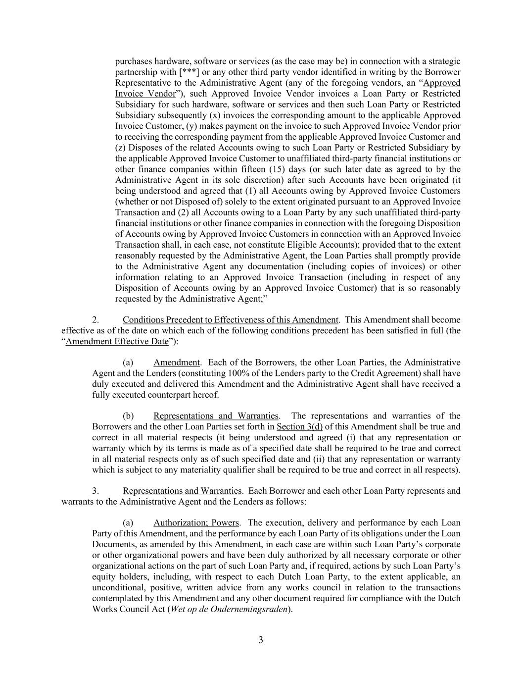 3 purchases hardware, software or services (as the case may be) in connection with a strategic partnership with [***] or any other third party vendor identified in writing by the Borrower Representative to the Administrative Agent (any of the foregoing vendors, an “Approved Invoice Vendor”), such Approved Invoice Vendor invoices a Loan Party or Restricted Subsidiary for such hardware, software or services and then such Loan Party or Restricted Subsidiary subsequently (x) invoices the corresponding amount to the applicable Approved Invoice Customer, (y) makes payment on the invoice to such Approved Invoice Vendor prior to receiving the corresponding payment from the applicable Approved Invoice Customer and (z) Disposes of the related Accounts owing to such Loan Party or Restricted Subsidiary by the applicable Approved Invoice Customer to unaffiliated third-party financial institutions or other finance companies within fifteen (15) days (or such later date as agreed to by the Administrative Agent in its sole discretion) after such Accounts have been originated (it being understood and agreed that (1) all Accounts owing by Approved Invoice Customers (whether or not Disposed of) solely to the extent originated pursuant to an Approved Invoice Transaction and (2) all Accounts owing to a Loan Party by any such unaffiliated third-party financial institutions or other finance companies in connection with the foregoing Disposition of Accounts owing by Approved Invoice Customers in connection with an Approved Invoice Transaction shall, in each case, not constitute Eligible Accounts); provided that to the extent reasonably requested by the Administrative Agent, the Loan Parties shall promptly provide to the Administrative Agent any documentation (including copies of invoices) or other information relating to an Approved Invoice Transaction (including in respect of any Disposition of Accounts owing by an Approved Invoice Customer) that is so reasonably requested by the Administrative Agent;” 2. Conditions Precedent to Effectiveness of this Amendment. This Amendment shall become effective as of the date on which each of the following conditions precedent has been satisfied in full (the “Amendment Effective Date”): (a) Amendment. Each of the Borrowers, the other Loan Parties, the Administrative Agent and the Lenders (constituting 100% of the Lenders party to the Credit Agreement) shall have duly executed and delivered this Amendment and the Administrative Agent shall have received a fully executed counterpart hereof. (b) Representations and Warranties. The representations and warranties of the Borrowers and the other Loan Parties set forth in Section 3(d) of this Amendment shall be true and correct in all material respects (it being understood and agreed (i) that any representation or warranty which by its terms is made as of a specified date shall be required to be true and correct in all material respects only as of such specified date and (ii) that any representation or warranty which is subject to any materiality qualifier shall be required to be true and correct in all respects). 3. Representations and Warranties. Each Borrower and each other Loan Party represents and warrants to the Administrative Agent and the Lenders as follows: (a) Authorization; Powers. The execution, delivery and performance by each Loan Party of this Amendment, and the performance by each Loan Party of its obligations under the Loan Documents, as amended by this Amendment, in each case are within such Loan Party’s corporate or other organizational powers and have been duly authorized by all necessary corporate or other organizational actions on the part of such Loan Party and, if required, actions by such Loan Party’s equity holders, including, with respect to each Dutch Loan Party, to the extent applicable, an unconditional, positive, written advice from any works council in relation to the transactions contemplated by this Amendment and any other document required for compliance with the Dutch Works Council Act (Wet op de Ondernemingsraden).