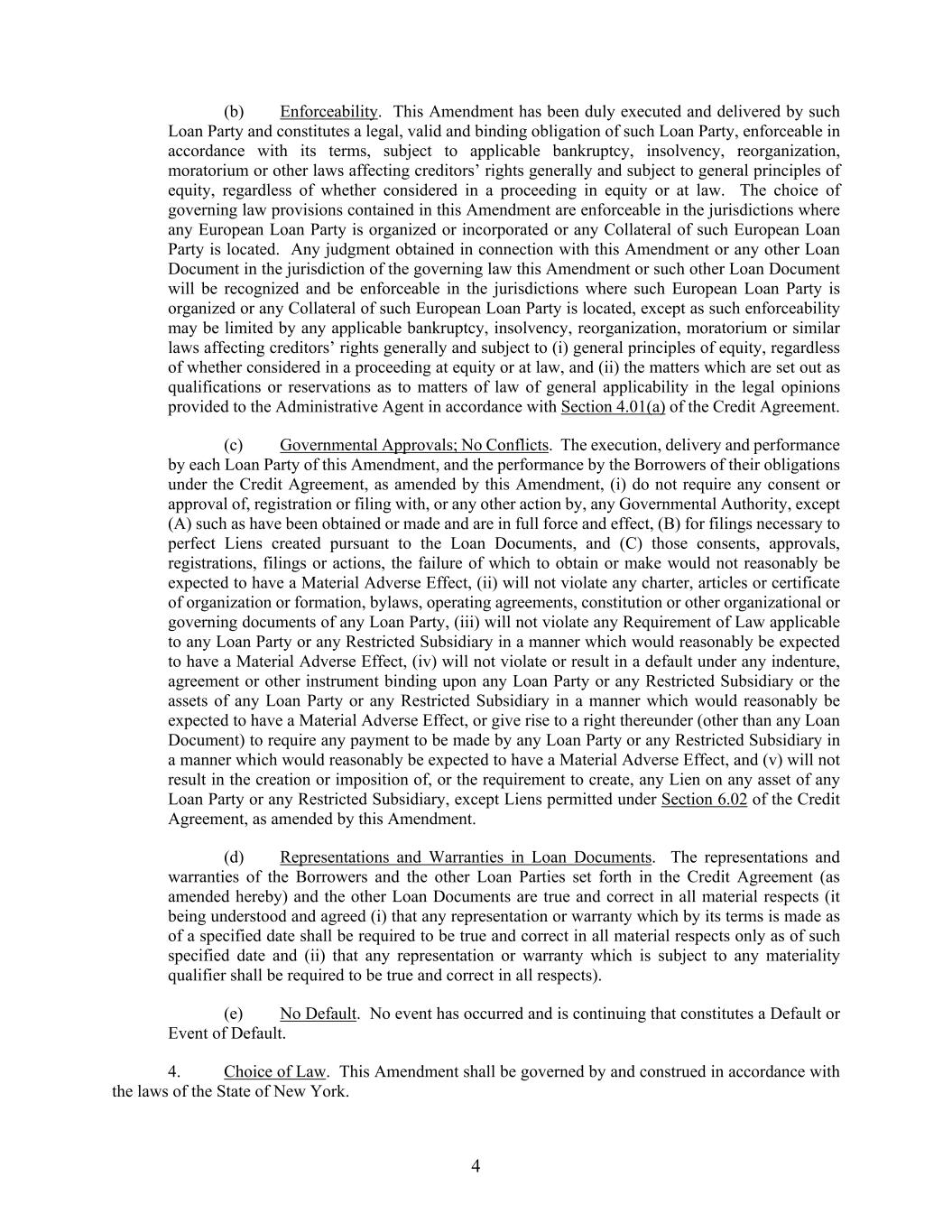 4 (b) Enforceability. This Amendment has been duly executed and delivered by such Loan Party and constitutes a legal, valid and binding obligation of such Loan Party, enforceable in accordance with its terms, subject to applicable bankruptcy, insolvency, reorganization, moratorium or other laws affecting creditors’ rights generally and subject to general principles of equity, regardless of whether considered in a proceeding in equity or at law. The choice of governing law provisions contained in this Amendment are enforceable in the jurisdictions where any European Loan Party is organized or incorporated or any Collateral of such European Loan Party is located. Any judgment obtained in connection with this Amendment or any other Loan Document in the jurisdiction of the governing law this Amendment or such other Loan Document will be recognized and be enforceable in the jurisdictions where such European Loan Party is organized or any Collateral of such European Loan Party is located, except as such enforceability may be limited by any applicable bankruptcy, insolvency, reorganization, moratorium or similar laws affecting creditors’ rights generally and subject to (i) general principles of equity, regardless of whether considered in a proceeding at equity or at law, and (ii) the matters which are set out as qualifications or reservations as to matters of law of general applicability in the legal opinions provided to the Administrative Agent in accordance with Section 4.01(a) of the Credit Agreement. (c) Governmental Approvals; No Conflicts. The execution, delivery and performance by each Loan Party of this Amendment, and the performance by the Borrowers of their obligations under the Credit Agreement, as amended by this Amendment, (i) do not require any consent or approval of, registration or filing with, or any other action by, any Governmental Authority, except (A) such as have been obtained or made and are in full force and effect, (B) for filings necessary to perfect Liens created pursuant to the Loan Documents, and (C) those consents, approvals, registrations, filings or actions, the failure of which to obtain or make would not reasonably be expected to have a Material Adverse Effect, (ii) will not violate any charter, articles or certificate of organization or formation, bylaws, operating agreements, constitution or other organizational or governing documents of any Loan Party, (iii) will not violate any Requirement of Law applicable to any Loan Party or any Restricted Subsidiary in a manner which would reasonably be expected to have a Material Adverse Effect, (iv) will not violate or result in a default under any indenture, agreement or other instrument binding upon any Loan Party or any Restricted Subsidiary or the assets of any Loan Party or any Restricted Subsidiary in a manner which would reasonably be expected to have a Material Adverse Effect, or give rise to a right thereunder (other than any Loan Document) to require any payment to be made by any Loan Party or any Restricted Subsidiary in a manner which would reasonably be expected to have a Material Adverse Effect, and (v) will not result in the creation or imposition of, or the requirement to create, any Lien on any asset of any Loan Party or any Restricted Subsidiary, except Liens permitted under Section 6.02 of the Credit Agreement, as amended by this Amendment. (d) Representations and Warranties in Loan Documents. The representations and warranties of the Borrowers and the other Loan Parties set forth in the Credit Agreement (as amended hereby) and the other Loan Documents are true and correct in all material respects (it being understood and agreed (i) that any representation or warranty which by its terms is made as of a specified date shall be required to be true and correct in all material respects only as of such specified date and (ii) that any representation or warranty which is subject to any materiality qualifier shall be required to be true and correct in all respects). (e) No Default. No event has occurred and is continuing that constitutes a Default or Event of Default. 4. Choice of Law. This Amendment shall be governed by and construed in accordance with the laws of the State of New York.