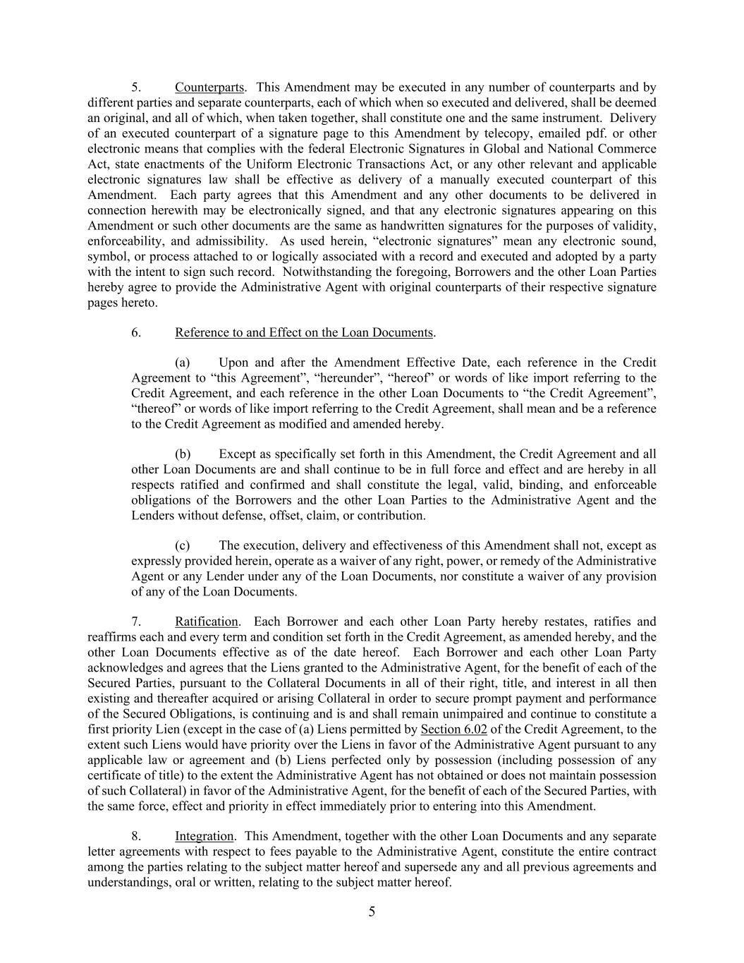 5 5. Counterparts. This Amendment may be executed in any number of counterparts and by different parties and separate counterparts, each of which when so executed and delivered, shall be deemed an original, and all of which, when taken together, shall constitute one and the same instrument. Delivery of an executed counterpart of a signature page to this Amendment by telecopy, emailed pdf. or other electronic means that complies with the federal Electronic Signatures in Global and National Commerce Act, state enactments of the Uniform Electronic Transactions Act, or any other relevant and applicable electronic signatures law shall be effective as delivery of a manually executed counterpart of this Amendment. Each party agrees that this Amendment and any other documents to be delivered in connection herewith may be electronically signed, and that any electronic signatures appearing on this Amendment or such other documents are the same as handwritten signatures for the purposes of validity, enforceability, and admissibility. As used herein, “electronic signatures” mean any electronic sound, symbol, or process attached to or logically associated with a record and executed and adopted by a party with the intent to sign such record. Notwithstanding the foregoing, Borrowers and the other Loan Parties hereby agree to provide the Administrative Agent with original counterparts of their respective signature pages hereto. 6. Reference to and Effect on the Loan Documents. (a) Upon and after the Amendment Effective Date, each reference in the Credit Agreement to “this Agreement”, “hereunder”, “hereof” or words of like import referring to the Credit Agreement, and each reference in the other Loan Documents to “the Credit Agreement”, “thereof” or words of like import referring to the Credit Agreement, shall mean and be a reference to the Credit Agreement as modified and amended hereby. (b) Except as specifically set forth in this Amendment, the Credit Agreement and all other Loan Documents are and shall continue to be in full force and effect and are hereby in all respects ratified and confirmed and shall constitute the legal, valid, binding, and enforceable obligations of the Borrowers and the other Loan Parties to the Administrative Agent and the Lenders without defense, offset, claim, or contribution. (c) The execution, delivery and effectiveness of this Amendment shall not, except as expressly provided herein, operate as a waiver of any right, power, or remedy of the Administrative Agent or any Lender under any of the Loan Documents, nor constitute a waiver of any provision of any of the Loan Documents. 7. Ratification. Each Borrower and each other Loan Party hereby restates, ratifies and reaffirms each and every term and condition set forth in the Credit Agreement, as amended hereby, and the other Loan Documents effective as of the date hereof. Each Borrower and each other Loan Party acknowledges and agrees that the Liens granted to the Administrative Agent, for the benefit of each of the Secured Parties, pursuant to the Collateral Documents in all of their right, title, and interest in all then existing and thereafter acquired or arising Collateral in order to secure prompt payment and performance of the Secured Obligations, is continuing and is and shall remain unimpaired and continue to constitute a first priority Lien (except in the case of (a) Liens permitted by Section 6.02 of the Credit Agreement, to the extent such Liens would have priority over the Liens in favor of the Administrative Agent pursuant to any applicable law or agreement and (b) Liens perfected only by possession (including possession of any certificate of title) to the extent the Administrative Agent has not obtained or does not maintain possession of such Collateral) in favor of the Administrative Agent, for the benefit of each of the Secured Parties, with the same force, effect and priority in effect immediately prior to entering into this Amendment. 8. Integration. This Amendment, together with the other Loan Documents and any separate letter agreements with respect to fees payable to the Administrative Agent, constitute the entire contract among the parties relating to the subject matter hereof and supersede any and all previous agreements and understandings, oral or written, relating to the subject matter hereof.