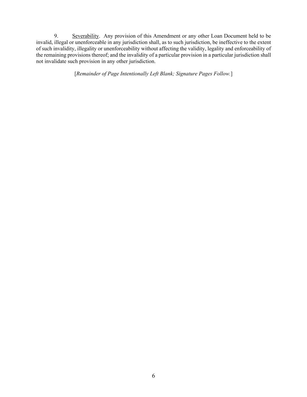 6 9. Severability. Any provision of this Amendment or any other Loan Document held to be invalid, illegal or unenforceable in any jurisdiction shall, as to such jurisdiction, be ineffective to the extent of such invalidity, illegality or unenforceability without affecting the validity, legality and enforceability of the remaining provisions thereof; and the invalidity of a particular provision in a particular jurisdiction shall not invalidate such provision in any other jurisdiction. [Remainder of Page Intentionally Left Blank; Signature Pages Follow.]