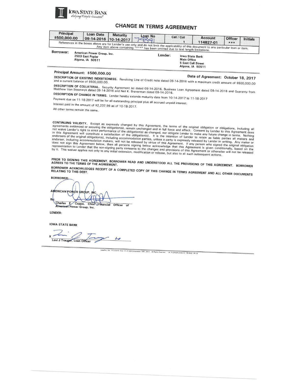 On November 21, 2017, American Power Group, Inc. (“APG”), a wholly owned subsidiary of American Power Group Corporation, and Iowa State Bank (the “Bank”), entered into a Change of Terms Agreement, pursuant to which the maturity of APG’s $500,000 Revolving Line of Credit was extended from November 18, 2017 to December 18, 2017.