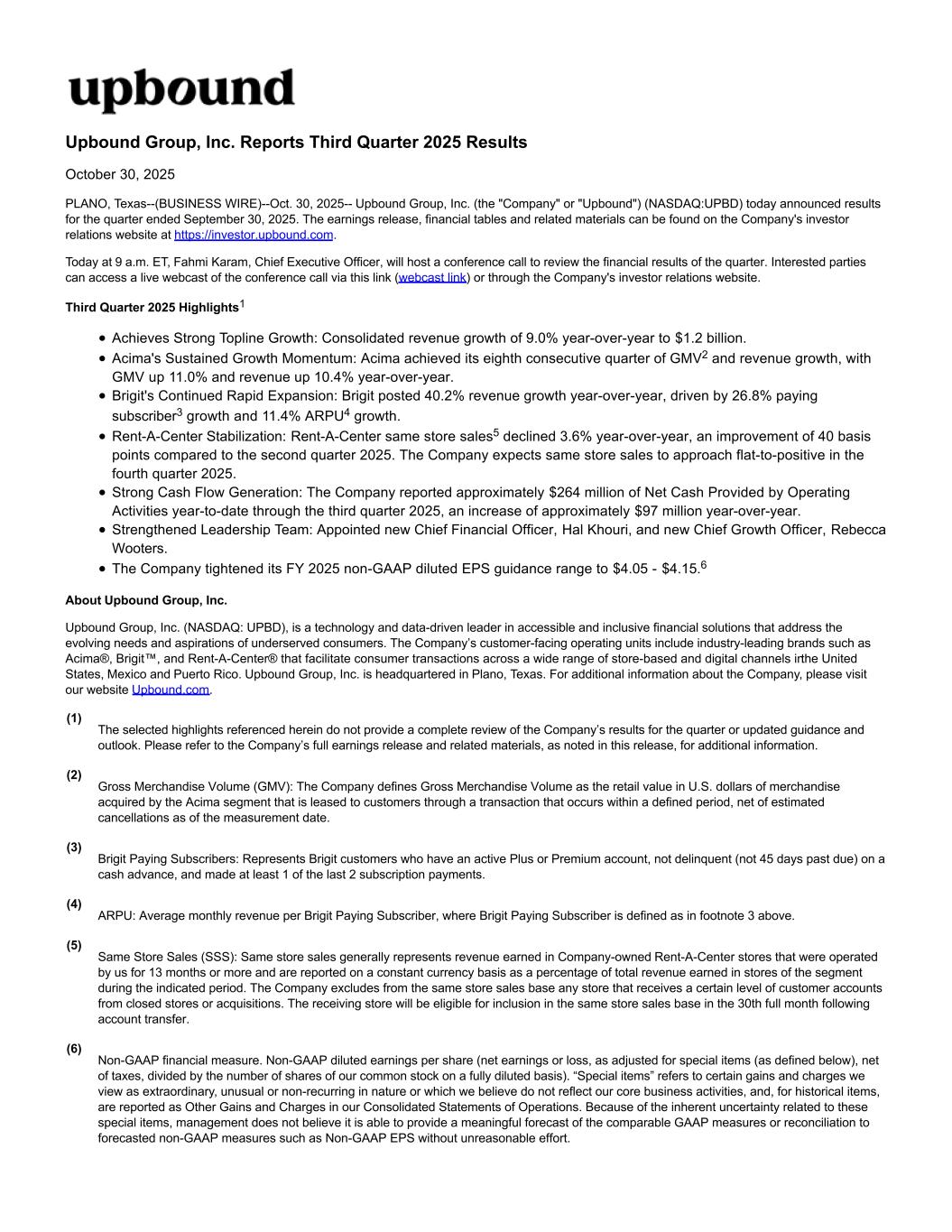 Upbound Group, Inc. Reports Third Quarter 2025 Results October 30, 2025 PLANO, Texas--(BUSINESS WIRE)--Oct. 30, 2025-- Upbound Group, Inc. (the "Company" or "Upbound") (NASDAQ:UPBD) today announced results for the quarter ended September 30, 2025. The earnings release, financial tables and related materials can be found on the Company's investor relations website at https://investor.upbound.com. Today at 9 a.m. ET, Fahmi Karam, Chief Executive Officer, will host a conference call to review the financial results of the quarter. Interested parties can access a live webcast of the conference call via this link (webcast link) or through the Company's investor relations website. Third Quarter 2025 Highlights1 Achieves Strong Topline Growth: Consolidated revenue growth of 9.0% year-over-year to $1.2 billion. Acima's Sustained Growth Momentum: Acima achieved its eighth consecutive quarter of GMV2 and revenue growth, with GMV up 11.0% and revenue up 10.4% year-over-year. Brigit's Continued Rapid Expansion: Brigit posted 40.2% revenue growth year-over-year, driven by 26.8% paying subscriber3 growth and 11.4% ARPU4 growth. Rent-A-Center Stabilization: Rent-A-Center same store sales5 declined 3.6% year-over-year, an improvement of 40 basis points compared to the second quarter 2025. The Company expects same store sales to approach flat-to-positive in the fourth quarter 2025. Strong Cash Flow Generation: The Company reported approximately $264 million of Net Cash Provided by Operating Activities year-to-date through the third quarter 2025, an increase of approximately $97 million year-over-year. Strengthened Leadership Team: Appointed new Chief Financial Officer, Hal Khouri, and new Chief Growth Officer, Rebecca Wooters. The Company tightened its FY 2025 non-GAAP diluted EPS guidance range to $4.05 - $4.15.6 About Upbound Group, Inc. Upbound Group, Inc. (NASDAQ: UPBD), is a technology and data-driven leader in accessible and inclusive financial solutions that address the evolving needs and aspirations of underserved consumers. The Company’s customer-facing operating units include industry-leading brands such as Acima®, Brigit™, and Rent-A-Center® that facilitate consumer transactions across a wide range of store-based and digital channels in the United States, Mexico and Puerto Rico. Upbound Group, Inc. is headquartered in Plano, Texas. For additional information about the Company, please visit our website Upbound.com. (1) The selected highlights referenced herein do not provide a complete review of the Company’s results for the quarter or updated guidance and outlook. Please refer to the Company’s full earnings release and related materials, as noted in this release, for additional information. (2) Gross Merchandise Volume (GMV): The Company defines Gross Merchandise Volume as the retail value in U.S. dollars of merchandise acquired by the Acima segment that is leased to customers through a transaction that occurs within a defined period, net of estimated cancellations as of the measurement date. (3) Brigit Paying Subscribers: Represents Brigit customers who have an active Plus or Premium account, not delinquent (not 45 days past due) on a cash advance, and made at least 1 of the last 2 subscription payments. (4) ARPU: Average monthly revenue per Brigit Paying Subscriber, where Brigit Paying Subscriber is defined as in footnote 3 above. (5) Same Store Sales (SSS): Same store sales generally represents revenue earned in Company-owned Rent-A-Center stores that were operated by us for 13 months or more and are reported on a constant currency basis as a percentage of total revenue earned in stores of the segment during the indicated period. The Company excludes from the same store sales base any store that receives a certain level of customer accounts from closed stores or acquisitions. The receiving store will be eligible for inclusion in the same store sales base in the 30th full month following account transfer. (6) Non-GAAP financial measure. Non-GAAP diluted earnings per share (net earnings or loss, as adjusted for special items (as defined below), net of taxes, divided by the number of shares of our common stock on a fully diluted basis). “Special items” refers to certain gains and charges we view as extraordinary, unusual or non-recurring in nature or which we believe do not reflect our core business activities, and, for historical items, are reported as Other Gains and Charges in our Consolidated Statements of Operations. Because of the inherent uncertainty related to these special items, management does not believe it is able to provide a meaningful forecast of the comparable GAAP measures or reconciliation to forecasted non-GAAP measures such as Non-GAAP EPS without unreasonable effort.