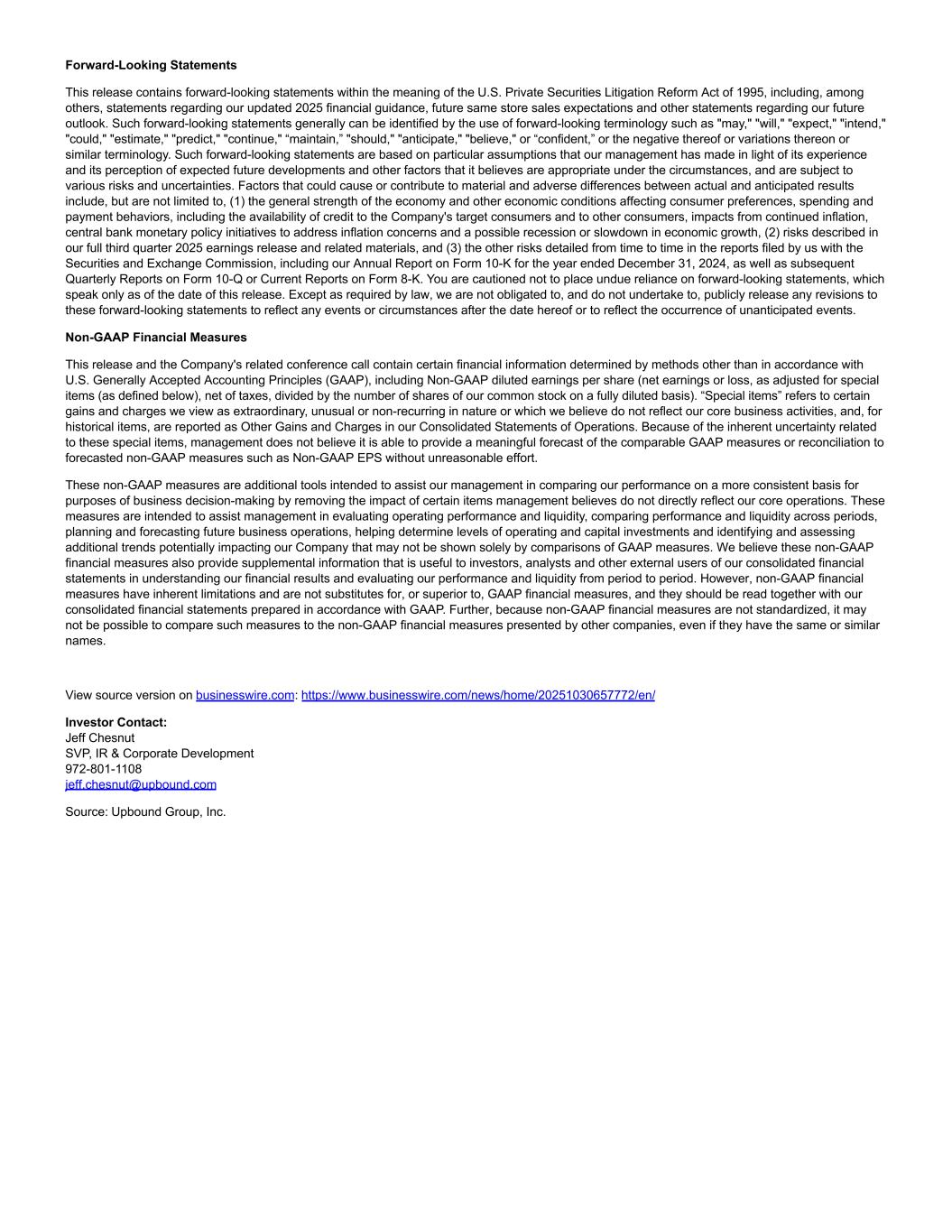 Forward-Looking Statements This release contains forward-looking statements within the meaning of the U.S. Private Securities Litigation Reform Act of 1995, including, among others, statements regarding our updated 2025 financial guidance, future same store sales expectations and other statements regarding our future outlook. Such forward-looking statements generally can be identified by the use of forward-looking terminology such as "may," "will," "expect," "intend," "could," "estimate," "predict," "continue," “maintain,” "should," "anticipate," "believe," or “confident,” or the negative thereof or variations thereon or similar terminology. Such forward-looking statements are based on particular assumptions that our management has made in light of its experience and its perception of expected future developments and other factors that it believes are appropriate under the circumstances, and are subject to various risks and uncertainties. Factors that could cause or contribute to material and adverse differences between actual and anticipated results include, but are not limited to, (1) the general strength of the economy and other economic conditions affecting consumer preferences, spending and payment behaviors, including the availability of credit to the Company's target consumers and to other consumers, impacts from continued inflation, central bank monetary policy initiatives to address inflation concerns and a possible recession or slowdown in economic growth, (2) risks described in our full third quarter 2025 earnings release and related materials, and (3) the other risks detailed from time to time in the reports filed by us with the Securities and Exchange Commission, including our Annual Report on Form 10-K for the year ended December 31, 2024, as well as subsequent Quarterly Reports on Form 10-Q or Current Reports on Form 8-K. You are cautioned not to place undue reliance on forward-looking statements, which speak only as of the date of this release. Except as required by law, we are not obligated to, and do not undertake to, publicly release any revisions to these forward-looking statements to reflect any events or circumstances after the date hereof or to reflect the occurrence of unanticipated events. Non-GAAP Financial Measures This release and the Company's related conference call contain certain financial information determined by methods other than in accordance with U.S. Generally Accepted Accounting Principles (GAAP), including Non-GAAP diluted earnings per share (net earnings or loss, as adjusted for special items (as defined below), net of taxes, divided by the number of shares of our common stock on a fully diluted basis). “Special items” refers to certain gains and charges we view as extraordinary, unusual or non-recurring in nature or which we believe do not reflect our core business activities, and, for historical items, are reported as Other Gains and Charges in our Consolidated Statements of Operations. Because of the inherent uncertainty related to these special items, management does not believe it is able to provide a meaningful forecast of the comparable GAAP measures or reconciliation to forecasted non-GAAP measures such as Non-GAAP EPS without unreasonable effort. These non-GAAP measures are additional tools intended to assist our management in comparing our performance on a more consistent basis for purposes of business decision-making by removing the impact of certain items management believes do not directly reflect our core operations. These measures are intended to assist management in evaluating operating performance and liquidity, comparing performance and liquidity across periods, planning and forecasting future business operations, helping determine levels of operating and capital investments and identifying and assessing additional trends potentially impacting our Company that may not be shown solely by comparisons of GAAP measures. We believe these non-GAAP financial measures also provide supplemental information that is useful to investors, analysts and other external users of our consolidated financial statements in understanding our financial results and evaluating our performance and liquidity from period to period. However, non-GAAP financial measures have inherent limitations and are not substitutes for, or superior to, GAAP financial measures, and they should be read together with our consolidated financial statements prepared in accordance with GAAP. Further, because non-GAAP financial measures are not standardized, it may not be possible to compare such measures to the non-GAAP financial measures presented by other companies, even if they have the same or similar names. View source version on businesswire.com: https://www.businesswire.com/news/home/20251030657772/en/ Investor Contact: Jeff Chesnut SVP, IR & Corporate Development 972-801-1108 jeff.chesnut@upbound.com Source: Upbound Group, Inc.
