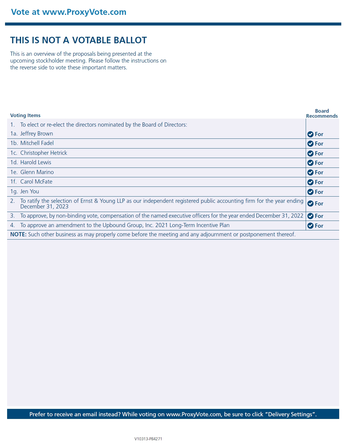 Vote at www.ProxyVote.comTHIS IS NOT A VOTABLE BALLOT This is an overview of the proposals being presented at the upcoming stockholder meeting. Please follow the instructions on the reverse side to vote these important matters.Voting Items 1. To elect or re-elect the directors nominated by the Board of Directors: 1a. Jeffrey Brown 1b. Mitchell Fadel 1c. Christopher Hetrick 1d. Harold Lewis 1e. Glenn Marino 1f. Carol McFate 1g. Jen You 2. To ratify the selection of Ernst & Young LLP as our independent registered public accounting firm for the year ending December 31, 2023 3. To approve, by non-binding vote, compensation of the named executive officers for the year ended December 31, 2022 4. To approve an amendment to the Upbound Group, Inc. 2021 Long-Term Incentive Plan NOTE: Such other business as may properly come before the meeting and any adjournment or postponement thereof.Board RecommendsFor For For For For For For For For ForPrefer to receive an email instead? While voting on www.ProxyVote.com, be sure to click “Delivery Settings”.