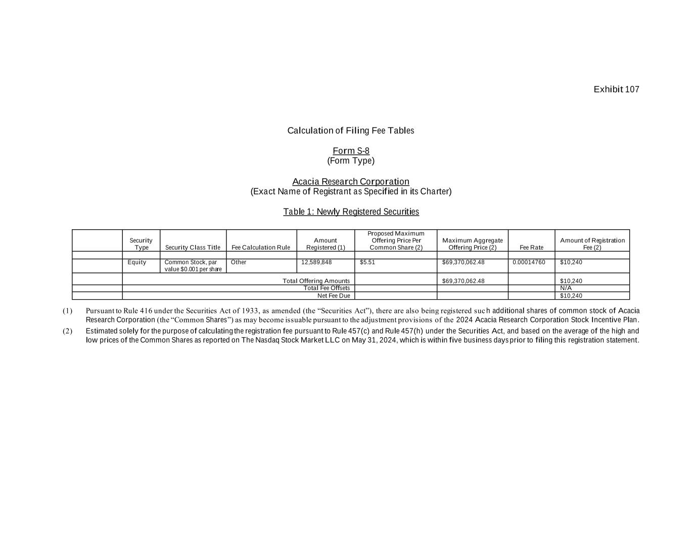 Exhibit 107 Calculation of Filing Fee Tables Form S-8 (Form Type) Acacia Research Corporation (Exact Name of Registrant as Specified in its Charter) Table 1: Newly Registered Securities Security Type Security Class Title Fee Calculation Rule Amount Registered (1) Proposed Maximum Offering Price Per Common Share (2) Maximum Aggregate Offering Price (2) Fee Rate Amount of Registration Fee (2) Equity Common Stock, par value $0.001 per share Other 12,589,848 $5.51 $69,370,062.48 0.00014760 $10,240 Total Offering Amounts $69,370,062.48 $10,240 Total Fee Offsets N/A Net Fee Due $10,240 (1) Pursuant to Rule 416 under the Securities Act of 1933, as amended (the “Securities Act”), there are also being registered suc h additional shares of common stock of Acacia Research Corporation (the “Common Shares”) as may become issuable pursuant to the adjustment provisions of the 2024 Acacia Research Corporation Stock Incentive Plan . (2) Estimated solely for the purpose of calculating the registration fee pursuant to Rule 457(c) and Rule 457(h) under the Securities Act, and based on the average of the high and low prices of the Common Shares as reported on The Nasdaq Stock Market LLC on May 31, 2024, which is within five business days prior to filing this registration statement.