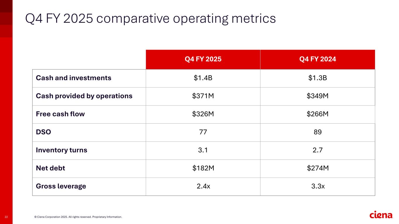 22 © Ciena Corporation 2025. All rights reserved. Proprietary Information. Q4 FY 2025 comparative operating metrics Q4 FY 2025 Q4 FY 2024 Cash and investments $1.4B $1.3B Cash provided by operations $371M $349M Free cash flow $326M $266M DSO 77 89 Inventory turns 3.1 2.7 Net debt $182M $274M Gross leverage 2.4x 3.3x