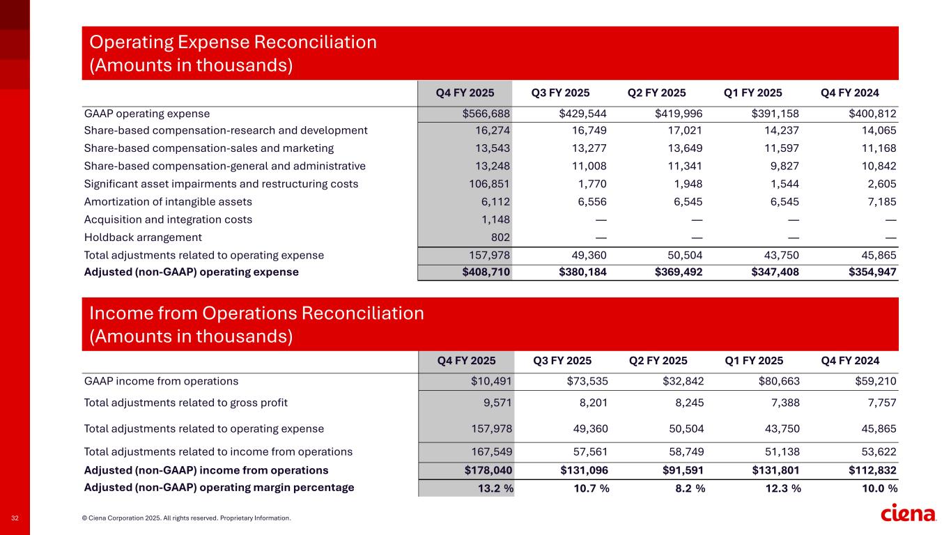 32 © Ciena Corporation 2025. All rights reserved. Proprietary Information. Q4 FY 2025 Q3 FY 2025 Q2 FY 2025 Q1 FY 2025 Q4 FY 2024 GAAP operating expense $566,688 $429,544 $419,996 $391,158 $400,812 Share-based compensation-research and development 16,274 16,749 17,021 14,237 14,065 Share-based compensation-sales and marketing 13,543 13,277 13,649 11,597 11,168 Share-based compensation-general and administrative 13,248 11,008 11,341 9,827 10,842 Significant asset impairments and restructuring costs 106,851 1,770 1,948 1,544 2,605 Amortization of intangible assets 6,112 6,556 6,545 6,545 7,185 Acquisition and integration costs 1,148 — — — — Holdback arrangement 802 — — — — Total adjustments related to operating expense 157,978 49,360 50,504 43,750 45,865 Adjusted (non-GAAP) operating expense $408,710 $380,184 $369,492 $347,408 $354,947 Q4 FY 2025 Q3 FY 2025 Q2 FY 2025 Q1 FY 2025 Q4 FY 2024 GAAP income from operations $10,491 $73,535 $32,842 $80,663 $59,210 Total adjustments related to gross profit 9,571 8,201 8,245 7,388 7,757 Total adjustments related to operating expense 157,978 49,360 50,504 43,750 45,865 Total adjustments related to income from operations 167,549 57,561 58,749 51,138 53,622 Adjusted (non-GAAP) income from operations $178,040 $131,096 $91,591 $131,801 $112,832 Adjusted (non-GAAP) operating margin percentage 13.2 % 10.7 % 8.2 % 12.3 % 10.0 % Operating Expense Reconciliation (Amounts in thousands) Income from Operations Reconciliation (Amounts in thousands)