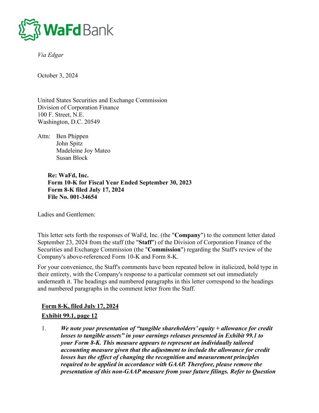 Via Edgar October 3, 2024 United States Securities and Exchange Commission Division of Corporation Finance 100 F. Street, N.E. Washington, D.C. 20549 Attn: Ben Phippen John Spitz Madeleine Joy Mateo Susan Block Re: WaFd, Inc. Form 10-K for Fiscal Year Ended September 30, 2023 Form 8-K filed July 17, 2024 File No. 001-34654 Ladies and Gentlemen: This letter sets forth the responses of WaFd, Inc. (the "Company") to the comment letter dated September 23, 2024 from the staff (the "Staff") of the Division of Corporation Finance of the Securities and Exchange Commission (the "Commission") regarding the Staff's review of the Company's above-referenced Form 10-K and Form 8-K. For your convenience, the Staff's comments have been repeated below in italicized, bold type in their entirety, with the Company's response to a particular comment set out immediately underneath it. The headings and numbered paragraphs in this letter correspond to the headings and numbered paragraphs in the comment letter from the Staff. Form 8-K, filed July 17, 2024 Exhibit 99.1, page 12 1. We note your presentation of “tangible shareholders’ equity + allowance for credit losses to tangible assets” in your earnings releases presented in Exhibit 99.1 to your Form 8-K. This measure appears to represent an individually tailored accounting measure given that the adjustment to include the allowance for credit losses has the effect of changing the recognition and measurement principles required to be applied in accordance with GAAP. Therefore, please remove the presentation of this non-GAAP measure from your future filings. Refer to Question