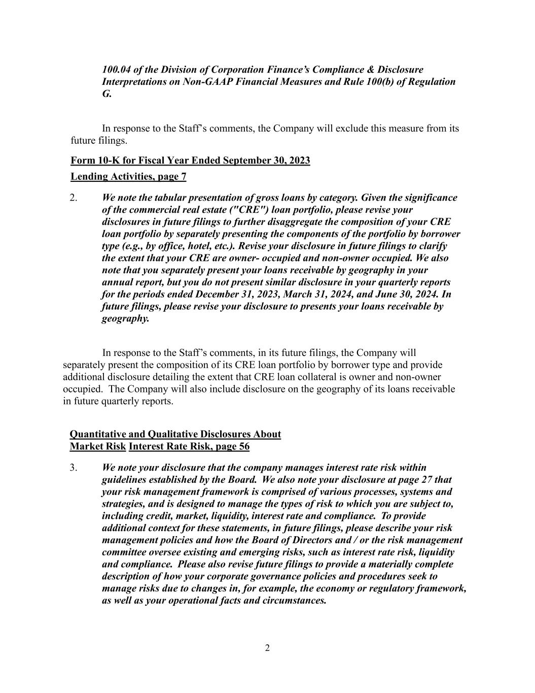 2 100.04 of the Division of Corporation Finance’s Compliance & Disclosure Interpretations on Non-GAAP Financial Measures and Rule 100(b) of Regulation G. In response to the Staff’s comments, the Company will exclude this measure from its future filings. Form 10-K for Fiscal Year Ended September 30, 2023 Lending Activities, page 7 2. We note the tabular presentation of gross loans by category. Given the significance of the commercial real estate ("CRE") loan portfolio, please revise your disclosures in future filings to further disaggregate the composition of your CRE loan portfolio by separately presenting the components of the portfolio by borrower type (e.g., by office, hotel, etc.). Revise your disclosure in future filings to clarify the extent that your CRE are owner- occupied and non-owner occupied. We also note that you separately present your loans receivable by geography in your annual report, but you do not present similar disclosure in your quarterly reports for the periods ended December 31, 2023, March 31, 2024, and June 30, 2024. In future filings, please revise your disclosure to presents your loans receivable by geography. In response to the Staff’s comments, in its future filings, the Company will separately present the composition of its CRE loan portfolio by borrower type and provide additional disclosure detailing the extent that CRE loan collateral is owner and non-owner occupied. The Company will also include disclosure on the geography of its loans receivable in future quarterly reports. Quantitative and Qualitative Disclosures About Market Risk Interest Rate Risk, page 56 3. We note your disclosure that the company manages interest rate risk within guidelines established by the Board. We also note your disclosure at page 27 that your risk management framework is comprised of various processes, systems and strategies, and is designed to manage the types of risk to which you are subject to, including credit, market, liquidity, interest rate and compliance. To provide additional context for these statements, in future filings, please describe your risk management policies and how the Board of Directors and / or the risk management committee oversee existing and emerging risks, such as interest rate risk, liquidity and compliance. Please also revise future filings to provide a materially complete description of how your corporate governance policies and procedures seek to manage risks due to changes in, for example, the economy or regulatory framework, as well as your operational facts and circumstances.