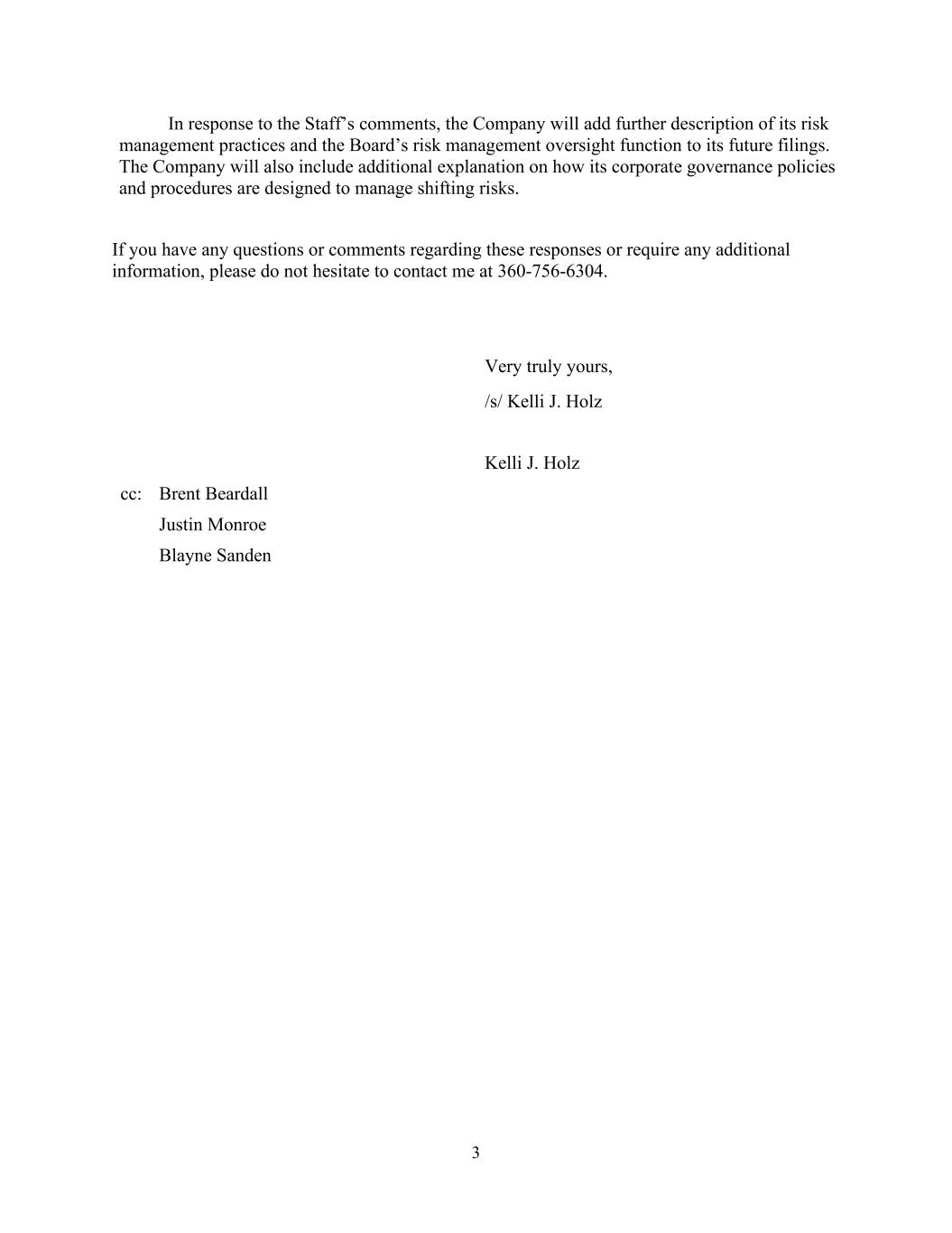 3 In response to the Staff’s comments, the Company will add further description of its risk management practices and the Board’s risk management oversight function to its future filings. The Company will also include additional explanation on how its corporate governance policies and procedures are designed to manage shifting risks. If you have any questions or comments regarding these responses or require any additional information, please do not hesitate to contact me at 360-756-6304. Very truly yours, /s/ Kelli J. Holz Kelli J. Holz cc: Brent Beardall Justin Monroe Blayne Sanden