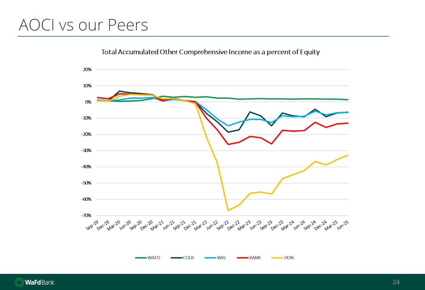 Cost of Deposits Through the Current Fed Rate Cycle 23 0.23% 0.42% 0.79% 1.34% 1.77% 2.07% 2.42% 2.65% 2.95% 3.11% 3.02% 2.89% 2.77% 0.94% 2.35% 3.82% 4.64% 5.07% 5.40% 5.40% 5.40% 5.40% 5.33% 4.71% 4.50% 4.50% Cost of All Deposits Avg Fed Funds (Upper) Jun-22 Sep-22 Dec-22 Mar-23 Jun-23 Sep-23 Dec-23 Mar-24 Jun-24 Sep-24 Dec-24 Mar-25 Jun-25 —% 1.00% 2.00% 3.00% 4.00% 5.00% 6.00%