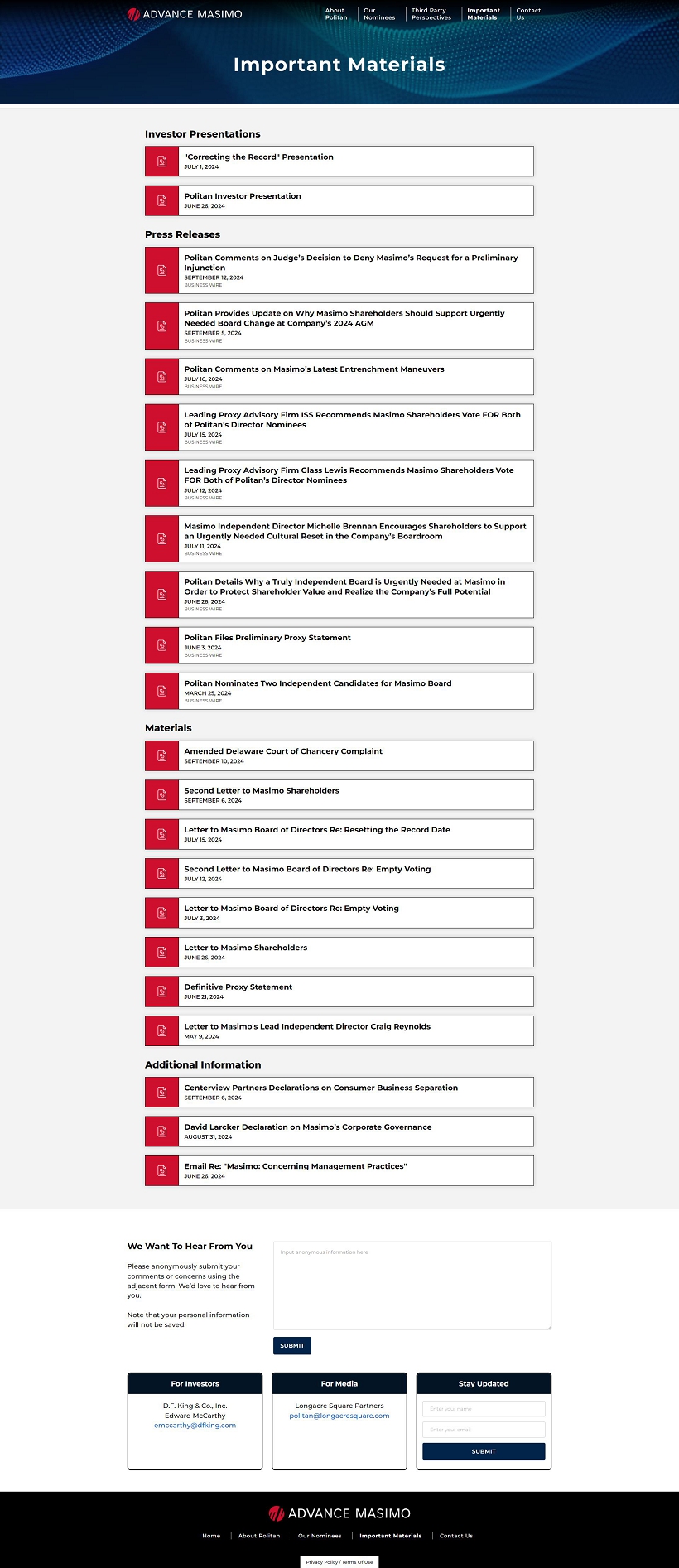Additionally, on September 12, 2024, Politan updated its website, www.AdvanceMasimo.com (the “Site”), in connection with the solicitation of stockholders of Masimo. Copies of the materials posted to the Site are filed herewith.