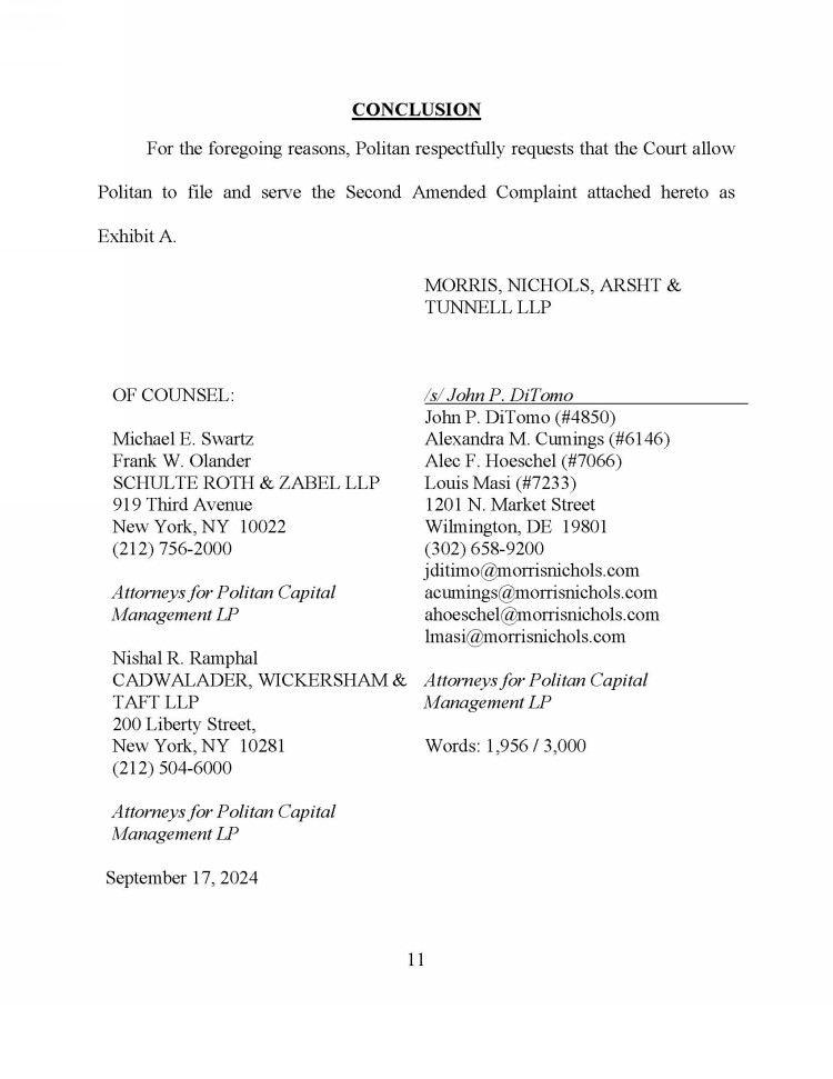 Additionally, on September 17, 2024, Politan filed the following Motion To Leave to File a Second Amended and Supplemented Verified Complaint: