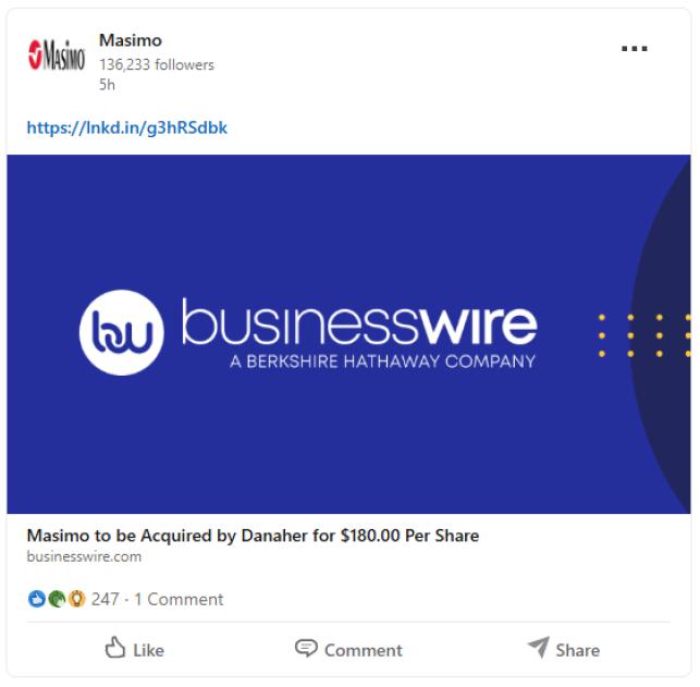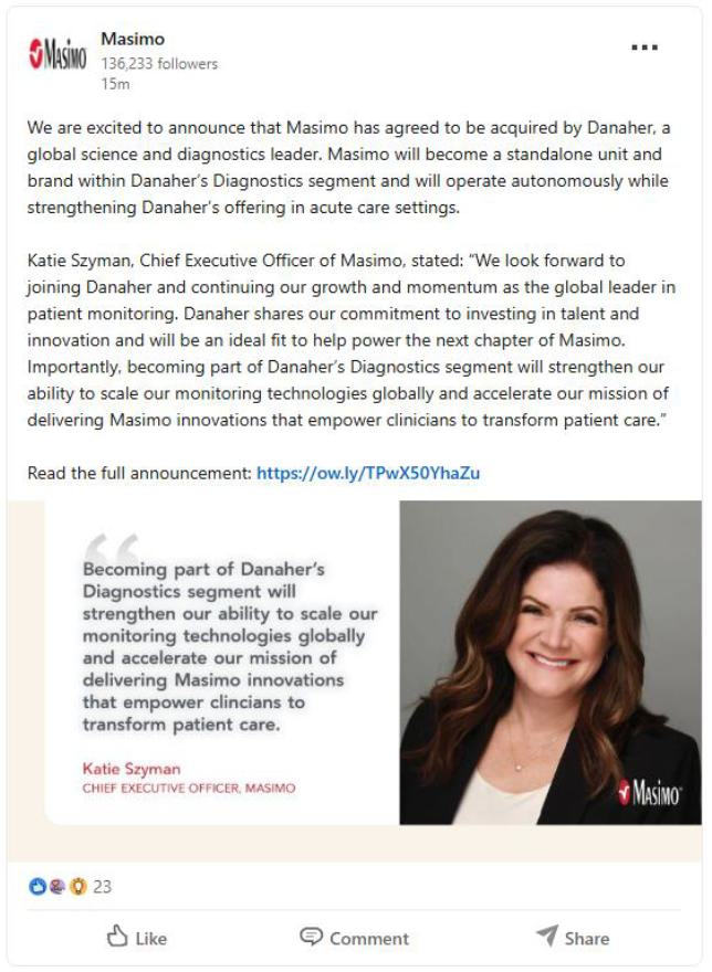 In connection with the proposed transaction (the “Transaction”), Masimo Corporation (“Masimo”) and Danaher Corporation (“Danaher”) intend to file relevant materials with the Securities and Exchange Commission (“SEC”), including Masimo’s proxy statement in preliminary and definitive form. Masimo will mail the definitive proxy statement and a proxy card to its stockholders in advance of the stockholders meeting in connection with the Transaction. This communication is not a substitute for the proxy statement or any other document that may be filed by Masimo with the SEC. INVESTORS AND STOCKHOLDERS OF MASIMO ARE URGED TO READ ALL RELEVANT DOCUMENTS FILED BY EACH OF DANAHER AND MASIMO WITH THE SEC IN CONNECTION WITH THE TRANSACTION OR INCORPORATED BY REFERENCE THEREIN, INCLUDING MASIMO’S PROXY STATEMENT (WHEN THEY ARE AVAILABLE), BECAUSE THEY CONTAIN OR WILL CONTAIN IMPORTANT INFORMATION ABOUT MASIMO, DANAHER, AND THE TRANSACTION AND RELATED MATTERS. Investors and stockholders are or will be able to obtain these documents (when they are available) free of charge from the SEC’s website at www.sec.gov. Danaher and Masimo make available free of charge at the Danaher website at https://investors.danaher.com/sec-filings and Masimo’s website at https://investor.masimo.com/resources/information-request-form/default.aspx, respectively, copies of documents they file with, or furnish to, the SEC. The contents of the websites referenced above will not be deemed to be incorporated by reference into the proxy statement.
