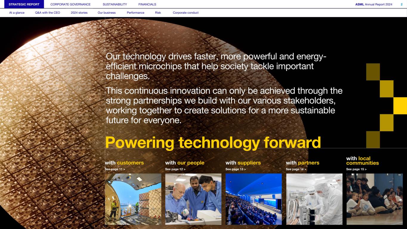 Our technology drives faster, more powerful and energy- efficient microchips that help society tackle important challenges. This continuous innovation can only be achieved through the strong partnerships we build with our various stakeholders, working together to create solutions for a more sustainable future for everyone. Powering technology forward with local communitieswith customers with our people with suppliers with partners See page 11 > See page 12 > See page 13 > See page 14 > See page 15 > STRATEGIC REPORT CORPORATE GOVERNANCE SUSTAINABILITY FINANCIALS ASML Annual Report 2024 2 At a glance Q&A with the CEO 2024 stories Our business Performance Risk Corporate conduct