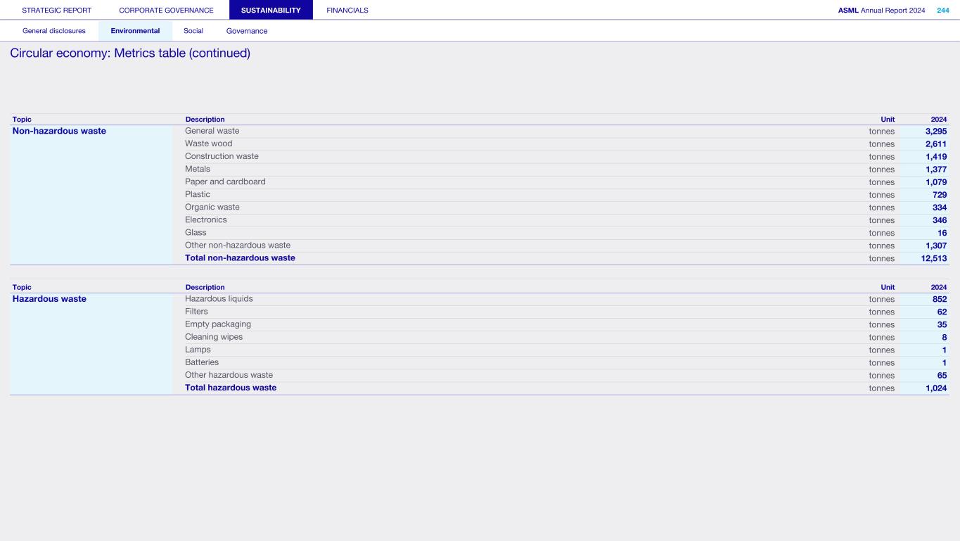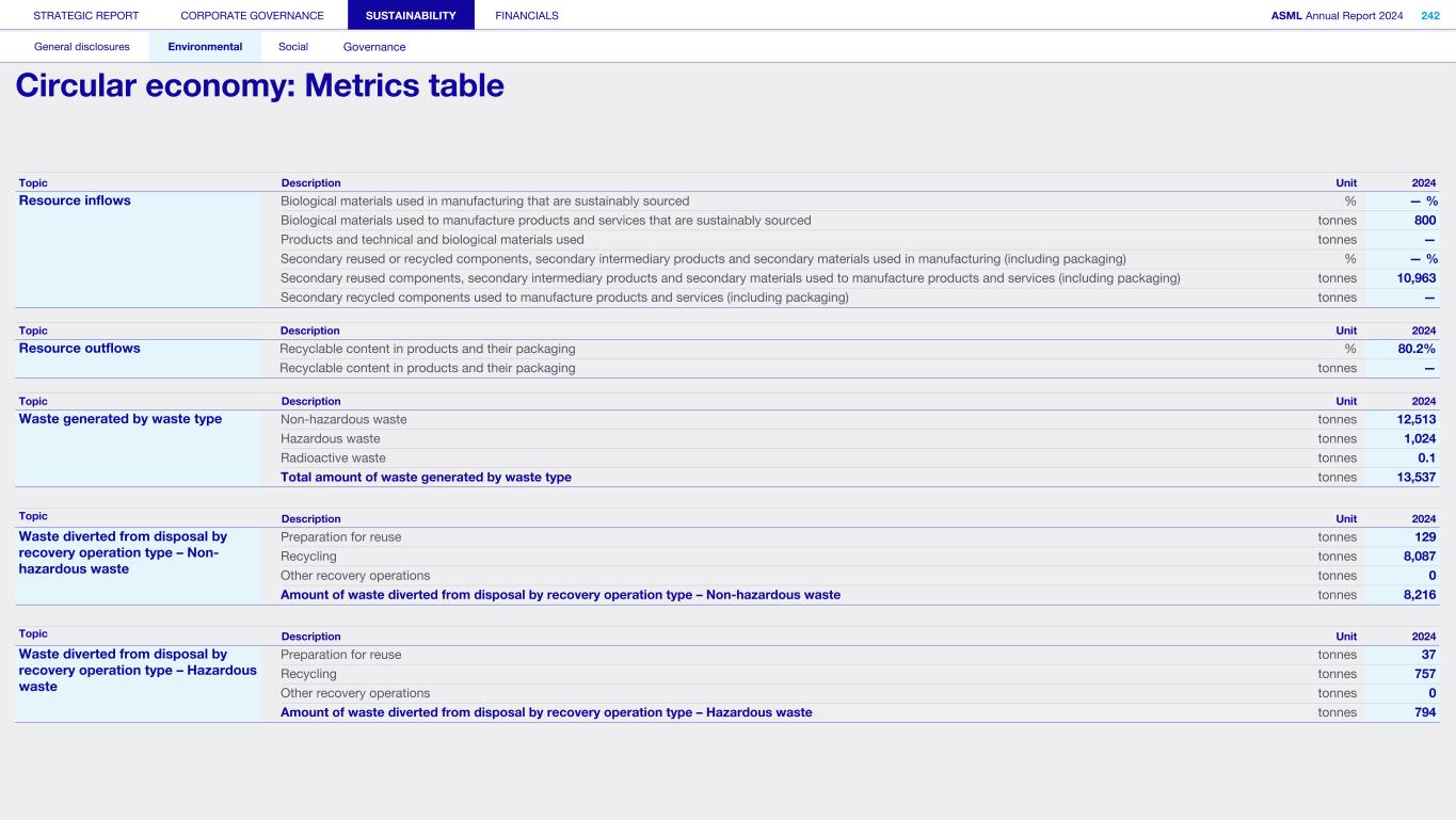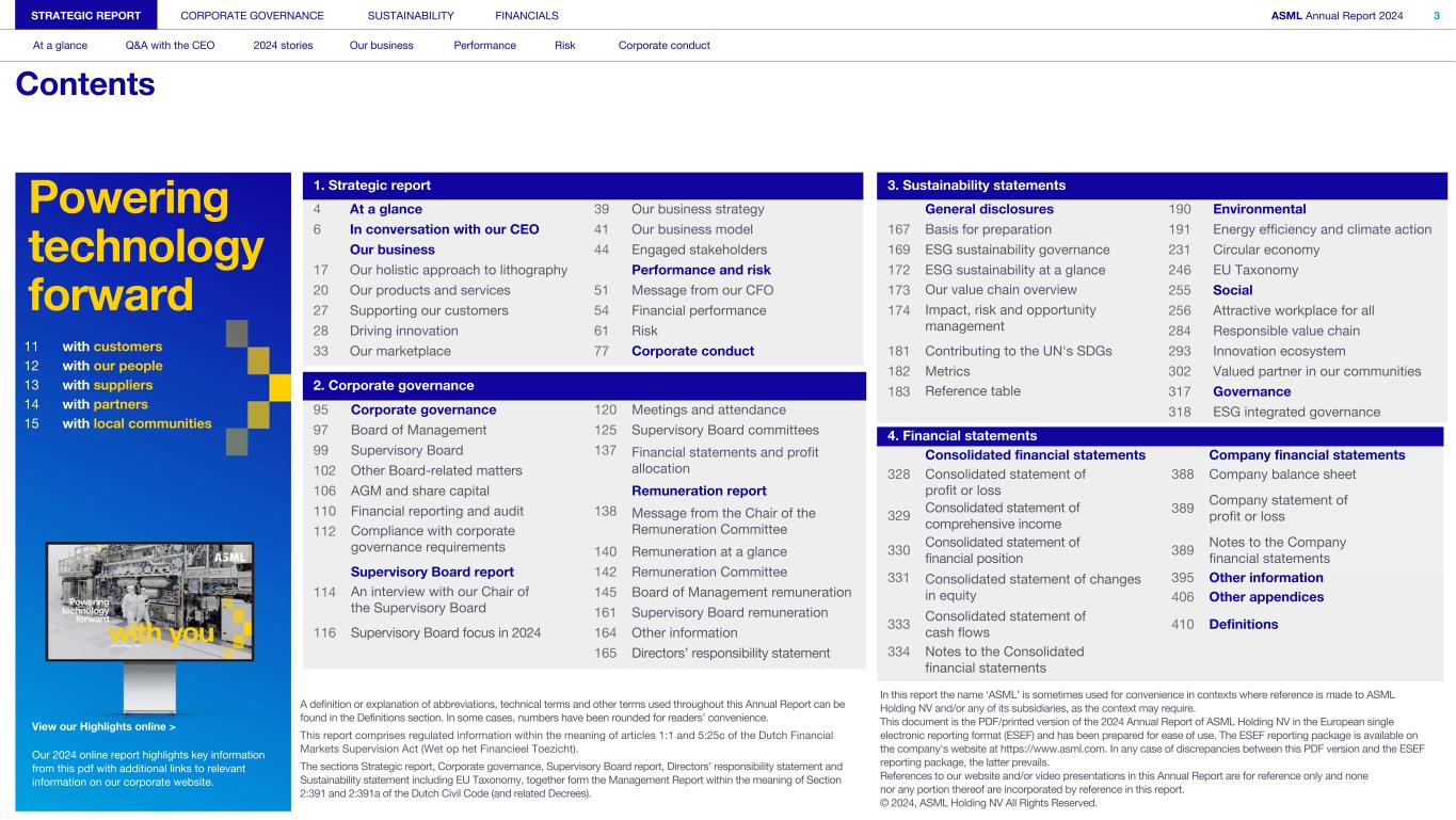Powering technology forward 11 with customers 12 with our people 13 with suppliers 14 with partners 15 with local communities View our Highlights online > Our 2024 online report highlights key information from this pdf with additional links to relevant information on our corporate website. STRATEGIC REPORT CORPORATE GOVERNANCE SUSTAINABILITY FINANCIALS ASML Annual Report 2024 3 At a glance Q&A with the CEO 2024 stories Our business Performance Risk Corporate conduct Contents 1. Strategic report 4 At a glance 39 Our business strategy 6 In conversation with our CEO 41 Our business model Our business 44 Engaged stakeholders 17 Our holistic approach to lithography Performance and risk 20 Our products and services 51 Message from our CFO 27 Supporting our customers 54 Financial performance 28 Driving innovation 61 Risk 33 Our marketplace 77 Corporate conduct 2. Corporate governance 95 Corporate governance 120 Meetings and attendance 97 Board of Management 125 Supervisory Board committees 99 Supervisory Board 137 Financial statements and profit allocation102 Other Board-related matters 106 AGM and share capital Remuneration report 110 Financial reporting and audit 138 Message from the Chair of the Remuneration Committee112 Compliance with corporate governance requirements 140 Remuneration at a glance Supervisory Board report 142 Remuneration Committee 114 An interview with our Chair of the Supervisory Board 145 Board of Management remuneration 161 Supervisory Board remuneration 116 Supervisory Board focus in 2024 164 Other information 165 Directors’ responsibility statement 3. Sustainability statements General disclosures 190 Environmental 167 Basis for preparation 191 Energy efficiency and climate action 169 ESG sustainability governance 231 Circular economy 172 ESG sustainability at a glance 246 EU Taxonomy 173 Our value chain overview 255 Social 174 Impact, risk and opportunity management 256 Attractive workplace for all 284 Responsible value chain 181 Contributing to the UN's SDGs 293 Innovation ecosystem 182 Metrics 302 Valued partner in our communities 183 Reference table 317 Governance 318 ESG integrated governance 4. Financial statements Consolidated financial statements Company financial statements 328 Consolidated statement of profit or loss 388 Company balance sheet 389 Company statement of profit or loss329 Consolidated statement of comprehensive income 330 Consolidated statement of financial position 389 Notes to the Company financial statements 331 Consolidated statement of changes in equity 395 Other information 406 Other appendices 333 Consolidated statement of cash flows 410 Definitions 334 Notes to the Consolidated financial statements A definition or explanation of abbreviations, technical terms and other terms used throughout this Annual Report can be found in the Definitions section. In some cases, numbers have been rounded for readers’ convenience. This report comprises regulated information within the meaning of articles 1:1 and 5:25c of the Dutch Financial Markets Supervision Act (Wet op het Financieel Toezicht). The sections Strategic report, Corporate governance, Supervisory Board report, Directors’ responsibility statement and Sustainability statement including EU Taxonomy, together form the Management Report within the meaning of Section 2:391 and 2:391a of the Dutch Civil Code (and related Decrees). In this report the name ‘ASML’ is sometimes used for convenience in contexts where reference is made to ASML Holding NV and/or any of its subsidiaries, as the context may require. This document is the PDF/printed version of the 2024 Annual Report of ASML Holding NV in the European single electronic reporting format (ESEF) and has been prepared for ease of use. The ESEF reporting package is available on the company's website at https://www.asml.com. In any case of discrepancies between this PDF version and the ESEF reporting package, the latter prevails. References to our website and/or video presentations in this Annual Report are for reference only and none nor any portion thereof are incorporated by reference in this report. © 2024, ASML Holding NV All Rights Reserved.