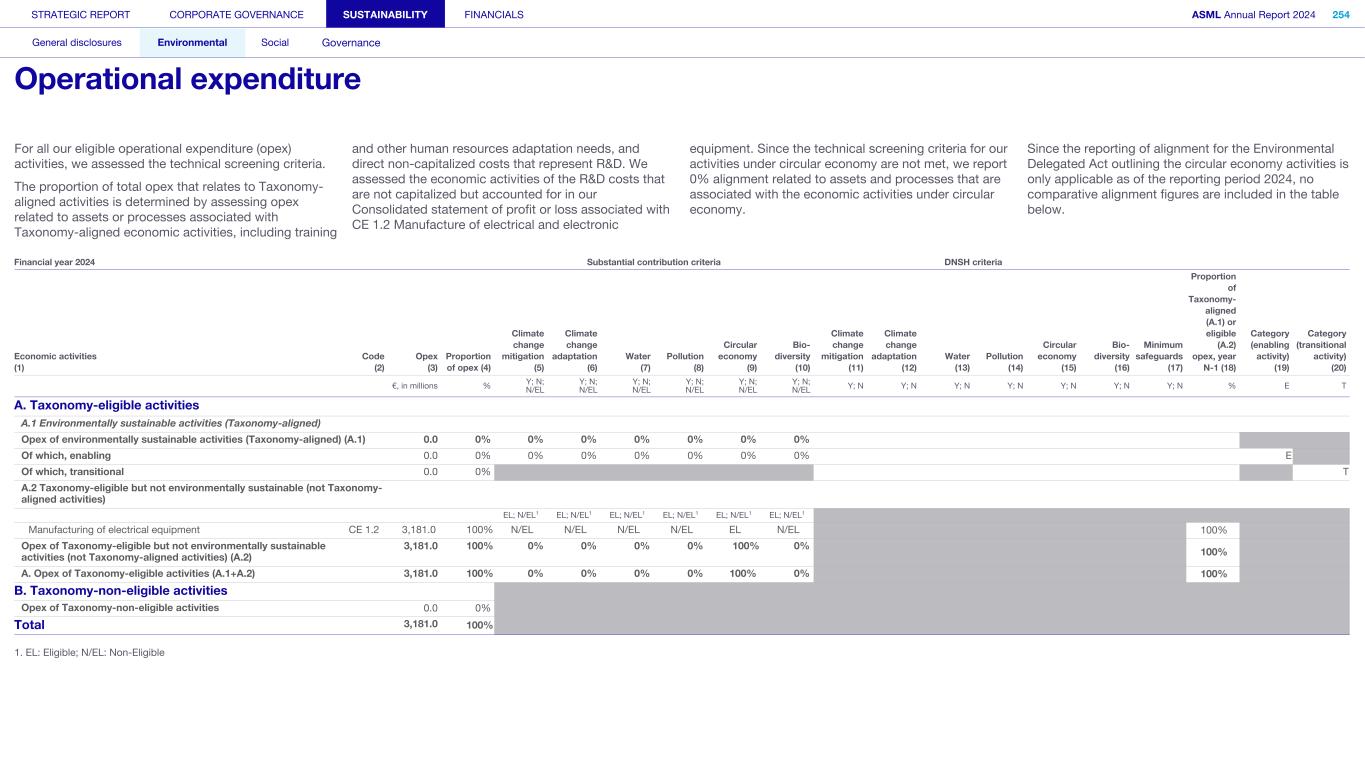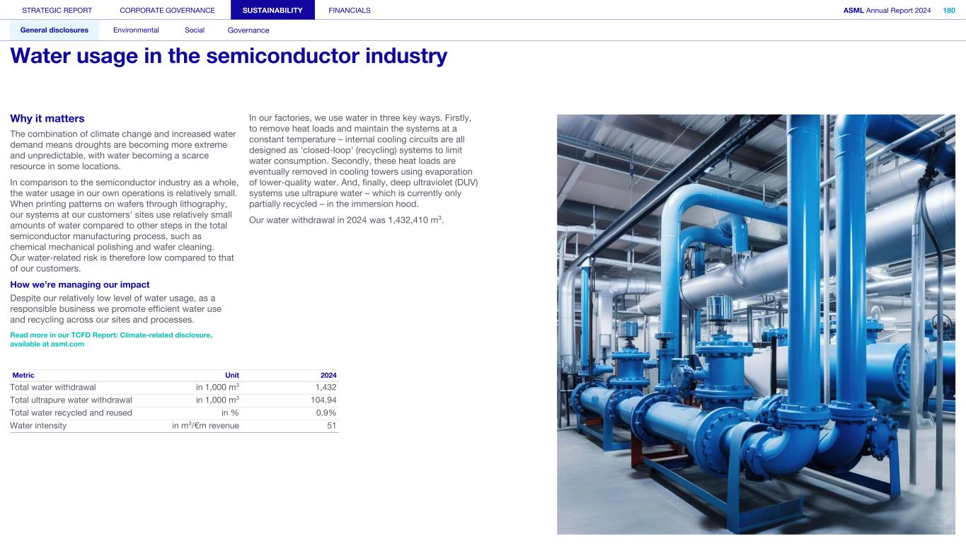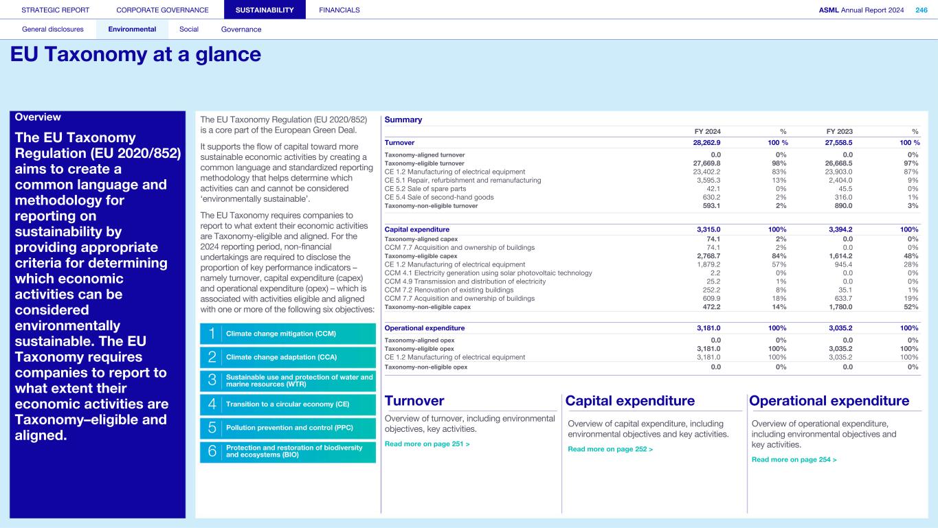 Powering technology forward 11 with customers 12 with our people 13 with suppliers 14 with partners 15 with local communities View our Highlights online > Our 2024 online report highlights key information from this pdf with additional links to relevant information on our corporate website. STRATEGIC REPORT CORPORATE GOVERNANCE SUSTAINABILITY FINANCIALS ASML Annual Report 2024 3 At a glance Q&A with the CEO 2024 stories Our business Performance Risk Corporate conduct Contents 1. Strategic report 4 At a glance 39 Our business strategy 6 In conversation with our CEO 41 Our business model Our business 44 Engaged stakeholders 17 Our holistic approach to lithography Performance and risk 20 Our products and services 51 Message from our CFO 27 Supporting our customers 54 Financial performance 28 Driving innovation 61 Risk 33 Our marketplace 77 Corporate conduct 2. Corporate governance 95 Corporate governance 120 Meetings and attendance 97 Board of Management 125 Supervisory Board committees 99 Supervisory Board 137 Financial statements and profit allocation102 Other Board-related matters 106 AGM and share capital Remuneration report 110 Financial reporting and audit 138 Message from the Chair of the Remuneration Committee112 Compliance with corporate governance requirements 140 Remuneration at a glance Supervisory Board report 142 Remuneration Committee 114 An interview with our Chair of the Supervisory Board 145 Board of Management remuneration 161 Supervisory Board remuneration 116 Supervisory Board focus in 2024 164 Other information 165 Directors’ responsibility statement 3. Sustainability statements General disclosures 190 Environmental 167 Basis for preparation 191 Energy efficiency and climate action 169 ESG sustainability governance 231 Circular economy 172 ESG sustainability at a glance 246 EU Taxonomy 173 Our value chain overview 255 Social 174 Impact, risk and opportunity management 256 Attractive workplace for all 284 Responsible value chain 181 Contributing to the UN's SDGs 293 Innovation ecosystem 182 Metrics 302 Valued partner in our communities 183 Reference table 317 Governance 318 ESG integrated governance 4. Financial statements Consolidated financial statements Company financial statements 328 Consolidated statement of profit or loss 388 Company balance sheet 389 Company statement of profit or loss329 Consolidated statement of comprehensive income 330 Consolidated statement of financial position 389 Notes to the Company financial statements 331 Consolidated statement of changes in equity 395 Other information 406 Other appendices 333 Consolidated statement of cash flows 410 Definitions 334 Notes to the Consolidated financial statements A definition or explanation of abbreviations, technical terms and other terms used throughout this Annual Report can be found in the Definitions section. In some cases, numbers have been rounded for readers’ convenience. This report comprises regulated information within the meaning of articles 1:1 and 5:25c of the Dutch Financial Markets Supervision Act (Wet op het Financieel Toezicht). The sections Strategic report, Corporate governance, Supervisory Board report, Directors’ responsibility statement and Sustainability statement including EU Taxonomy, together form the Management Report within the meaning of Section 2:391 and 2:391a of the Dutch Civil Code (and related Decrees). In this report the name ‘ASML’ is sometimes used for convenience in contexts where reference is made to ASML Holding NV and/or any of its subsidiaries, as the context may require. This document is the PDF/printed version of the 2024 Annual Report of ASML Holding NV in the European single electronic reporting format (ESEF) and has been prepared for ease of use. The ESEF reporting package is available on the company's website at https://www.asml.com. In any case of discrepancies between this PDF version and the ESEF reporting package, the latter prevails. References to our website and/or video presentations in this Annual Report are for reference only and none nor any portion thereof are incorporated by reference in this report. © 2024, ASML Holding NV All Rights Reserved.