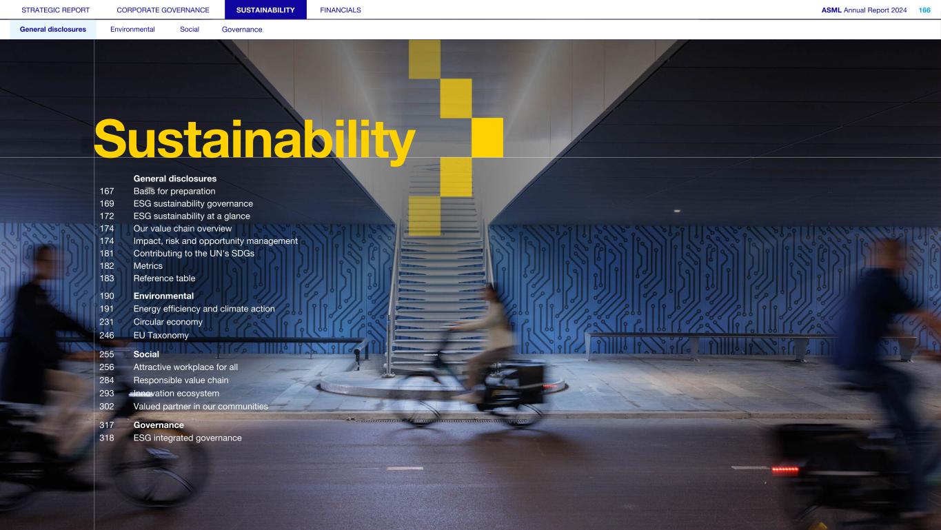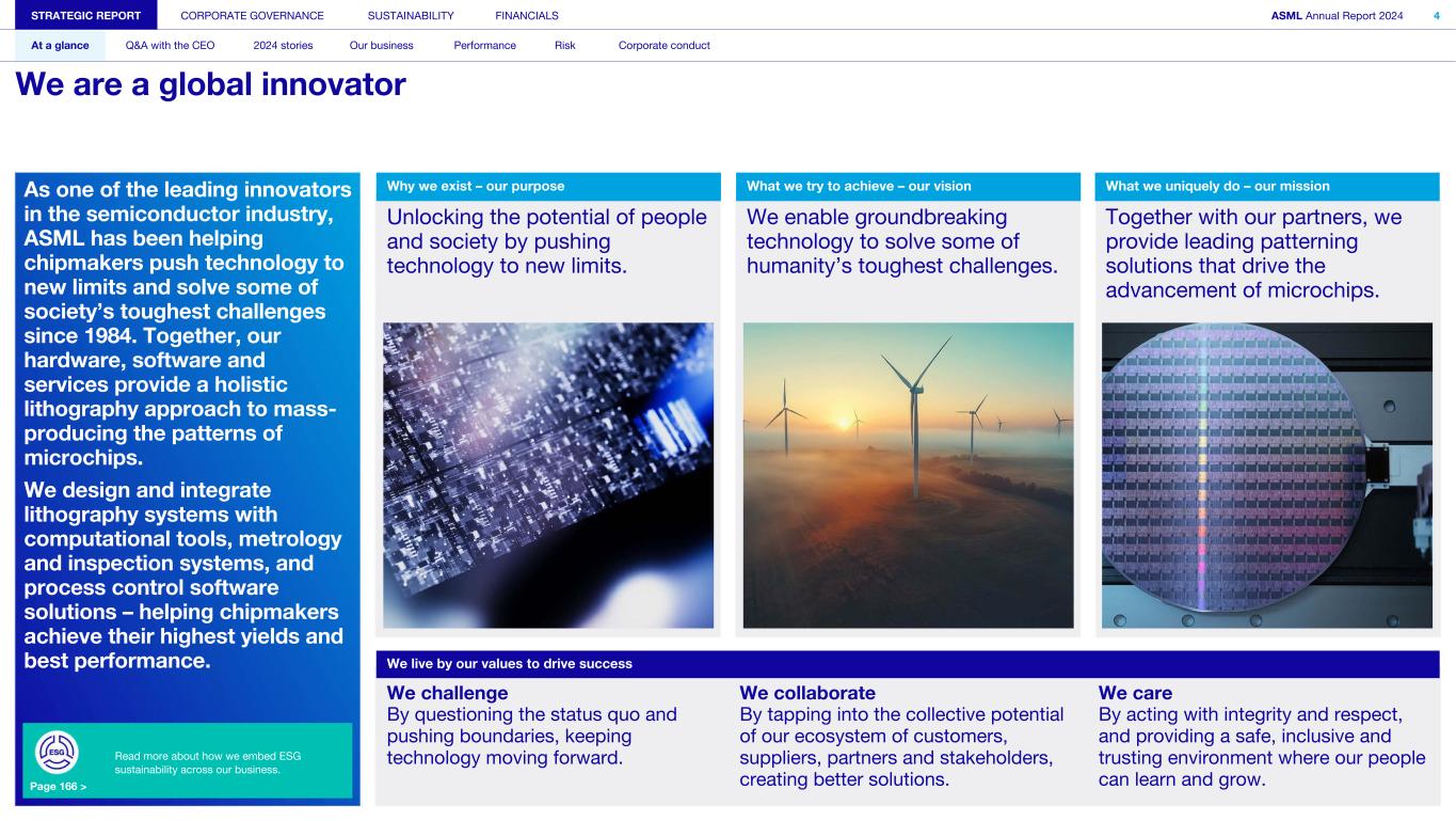 Why we exist – our purpose What we try to achieve – our vision What we uniquely do – our missionAs one of the leading innovators in the semiconductor industry, ASML has been helping chipmakers push technology to new limits and solve some of society’s toughest challenges since 1984. Together, our hardware, software and services provide a holistic lithography approach to mass- producing the patterns of microchips. We design and integrate lithography systems with computational tools, metrology and inspection systems, and process control software solutions – helping chipmakers achieve their highest yields and best performance. Unlocking the potential of people and society by pushing technology to new limits. We enable groundbreaking technology to solve some of humanity’s toughest challenges. Together with our partners, we provide leading patterning solutions that drive the advancement of microchips. We live by our values to drive success We challenge We collaborate We care By questioning the status quo and pushing boundaries, keeping technology moving forward. By tapping into the collective potential of our ecosystem of customers, suppliers, partners and stakeholders, creating better solutions. By acting with integrity and respect, and providing a safe, inclusive and trusting environment where our people can learn and grow. Page 166 > STRATEGIC REPORT CORPORATE GOVERNANCE SUSTAINABILITY FINANCIALS ASML Annual Report 2024 4 At a glance Q&A with the CEO 2024 stories Our business Performance Risk Corporate conduct We are a global innovator Read more about how we embed ESG sustainability across our business.