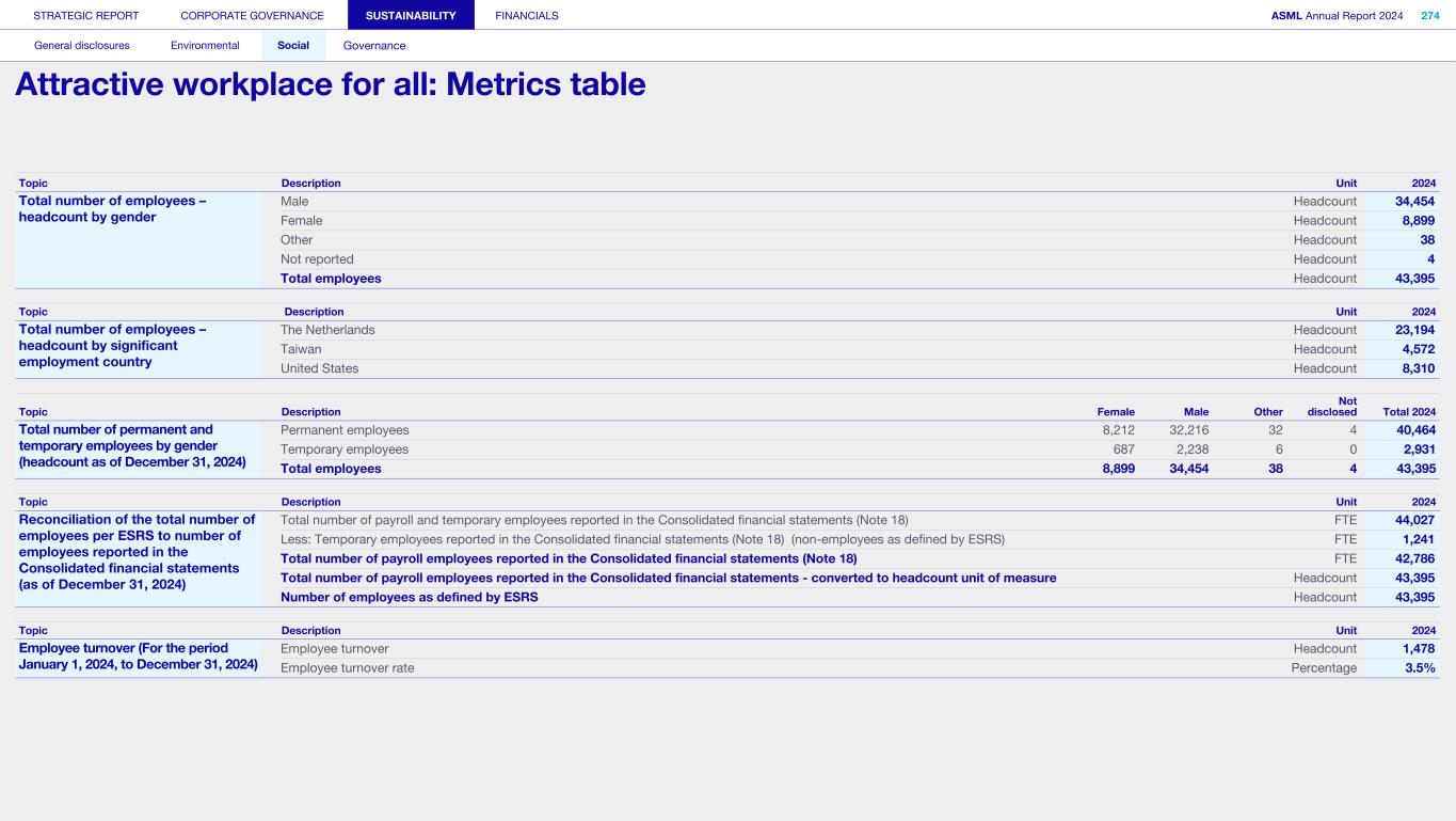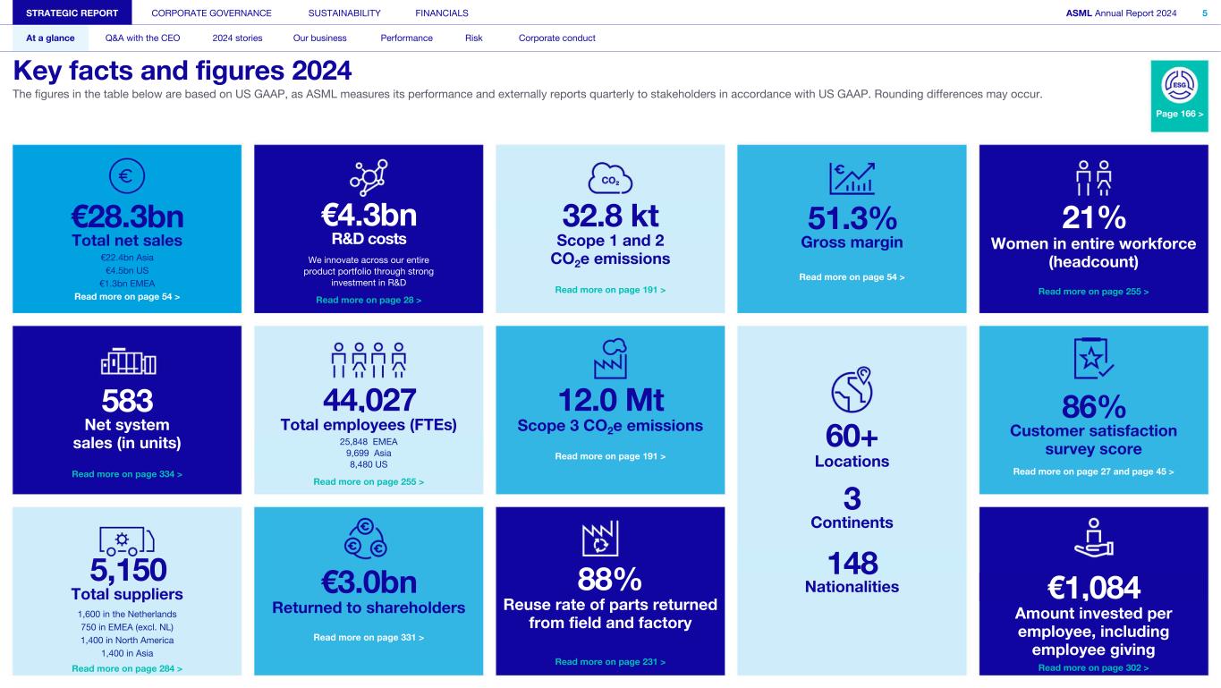 €28.3bn Total net sales €22.4bn Asia €4.5bn US €1.3bn EMEA Read more on page 54 > 583 Net system sales (in units) Read more on page 334 > 5,150 Total suppliers 1,600 in the Netherlands 750 in EMEA (excl. NL) 1,400 in North America 1,400 in Asia Read more on page 284 > €4.3bn R&D costs We innovate across our entire product portfolio through strong investment in R&D Read more on page 28 > 44,027 Total employees (FTEs) 25,848 EMEA 9,699 Asia 8,480 US Read more on page 255 > €3.0bn Returned to shareholders Read more on page 331 > 32.8 kt Scope 1 and 2 CO2e emissions Read more on page 191 > 12.0 Mt Scope 3 CO2e emissions Read more on page 191 > 88% Reuse rate of parts returned from field and factory Read more on page 231 > 51.3% Gross margin Read more on page 54 > 60+ Locations 3 Continents 148 Nationalities 21% Women in entire workforce (headcount) Read more on page 255 > 86% Customer satisfaction survey score Read more on page 27 and page 45 > €1,084 Amount invested per employee, including employee giving Read more on page 302 > STRATEGIC REPORT CORPORATE GOVERNANCE SUSTAINABILITY FINANCIALS ASML Annual Report 2024 5 At a glance Q&A with the CEO 2024 stories Our business Performance Risk Corporate conduct Key facts and figures 2024 The figures in the table below are based on US GAAP, as ASML measures its performance and externally reports quarterly to stakeholders in accordance with US GAAP. Rounding differences may occur. Page 166 >